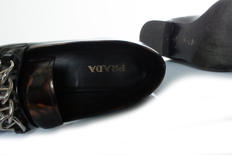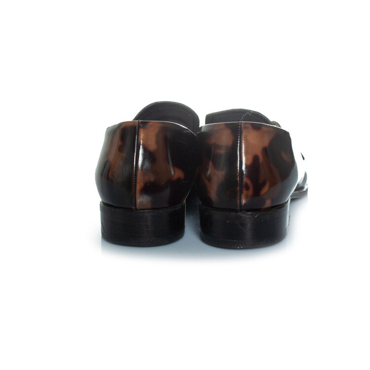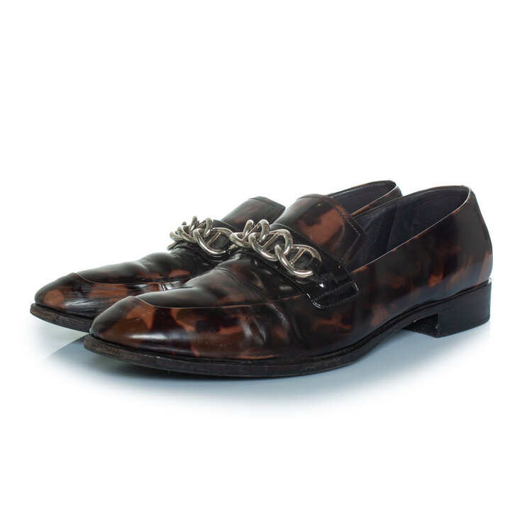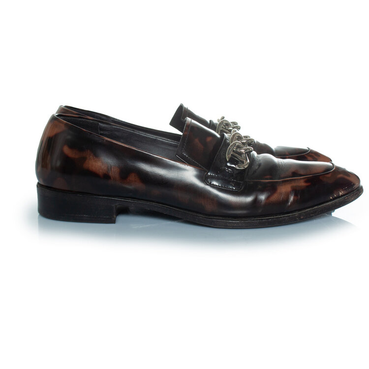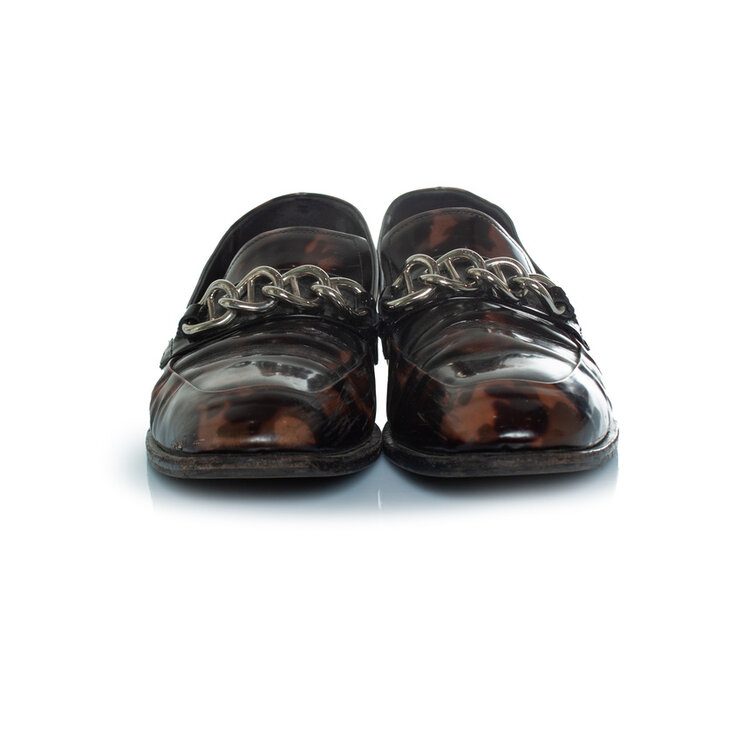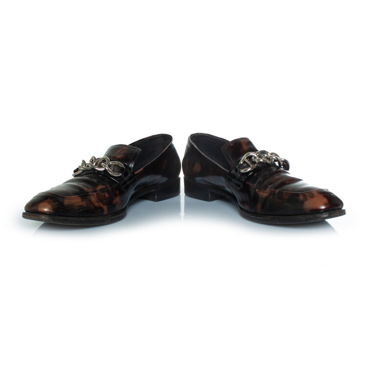 • Prada, Tortoise printed chain loafers in high shine leather. The item is in good condition.