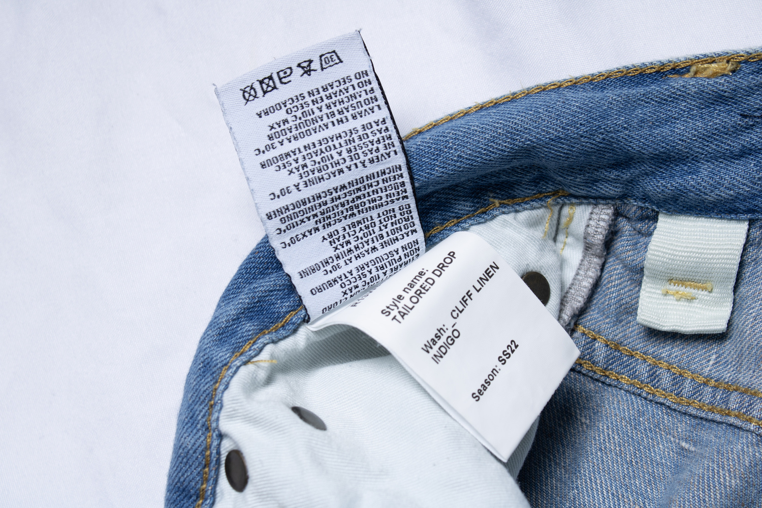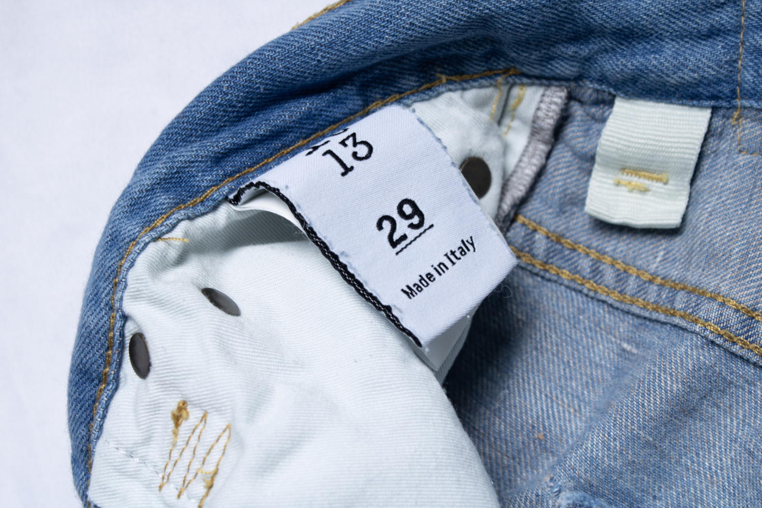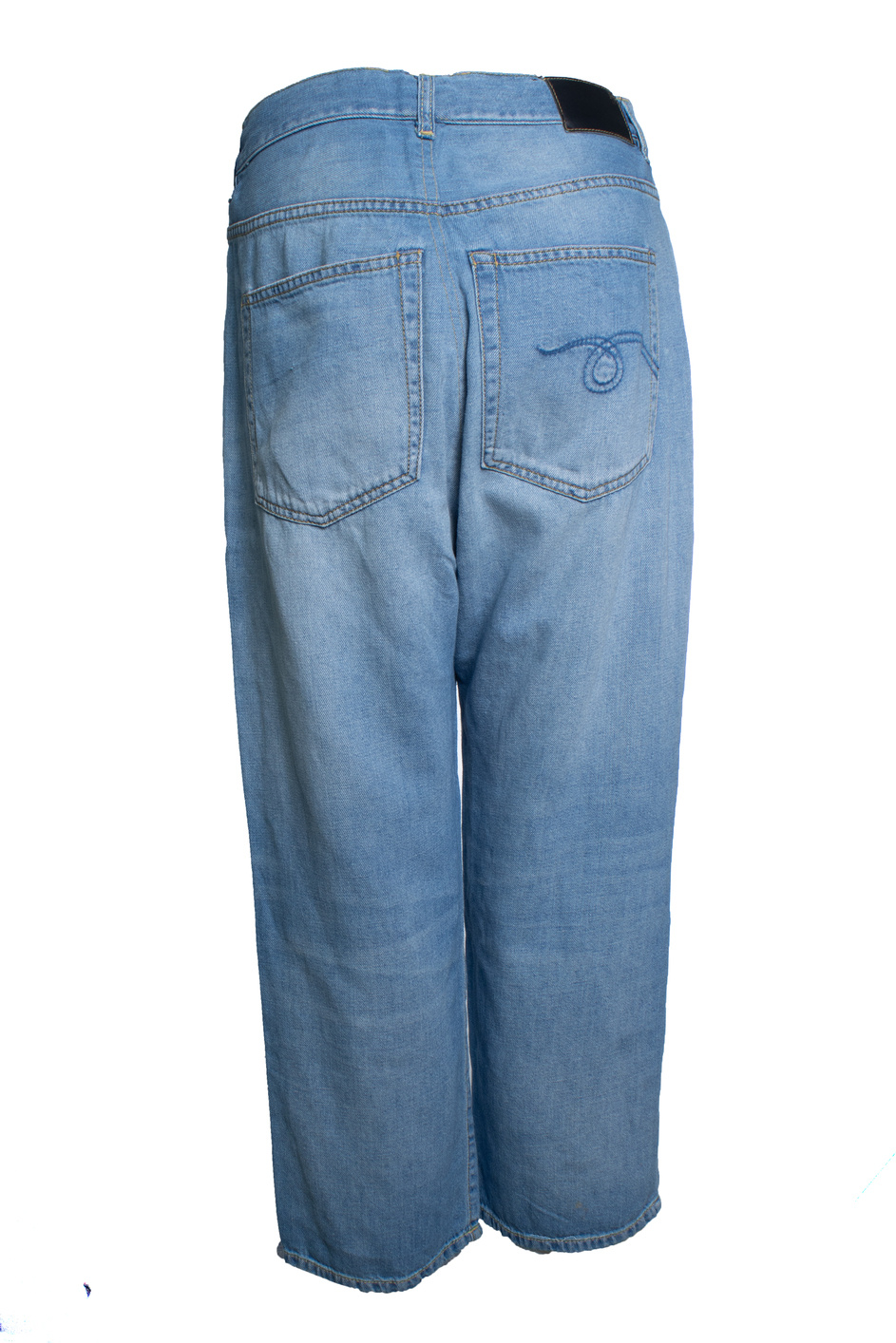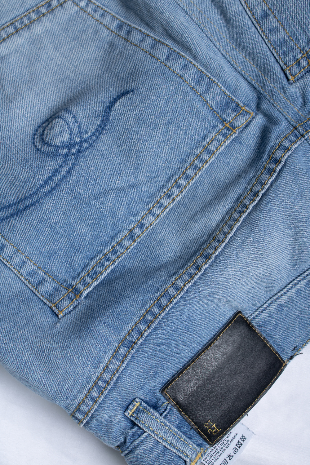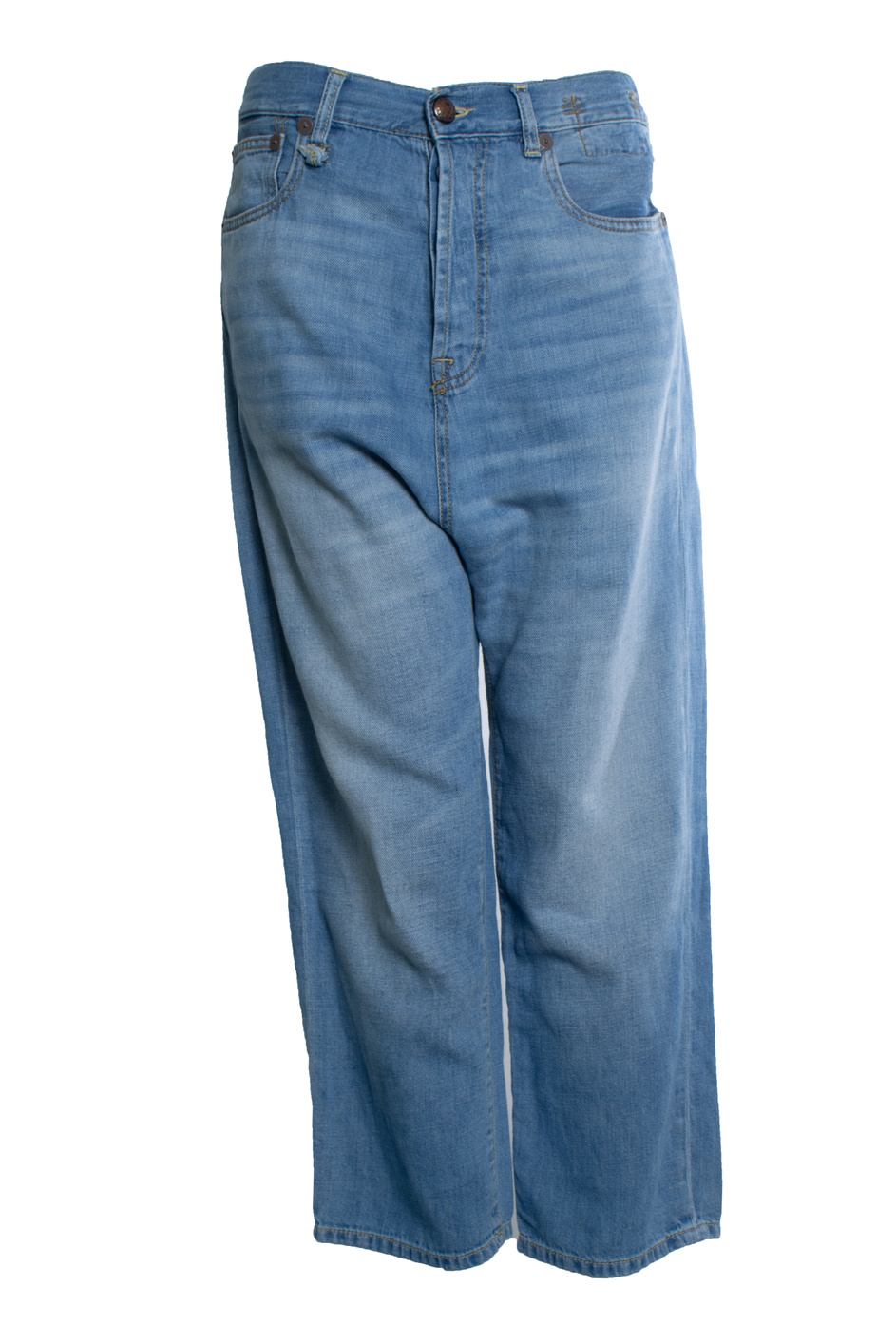• R13, tailored drop jeans in blue. The item is in good condition. Small stain on the back (ankle)