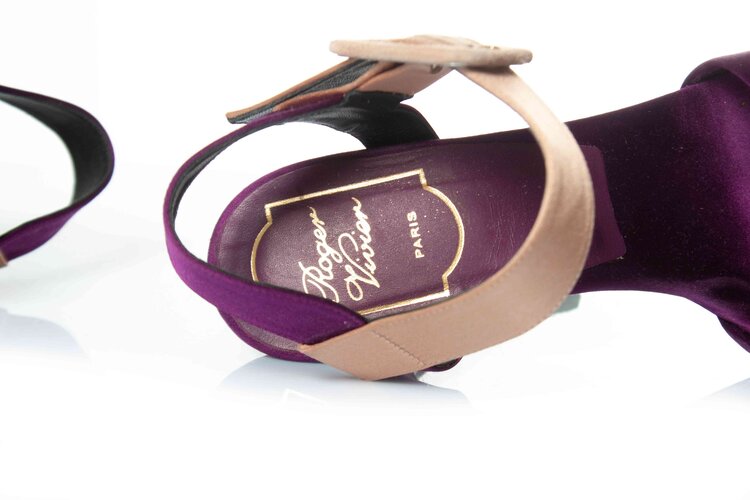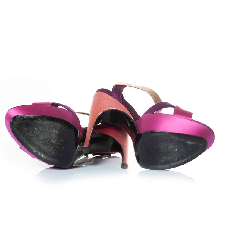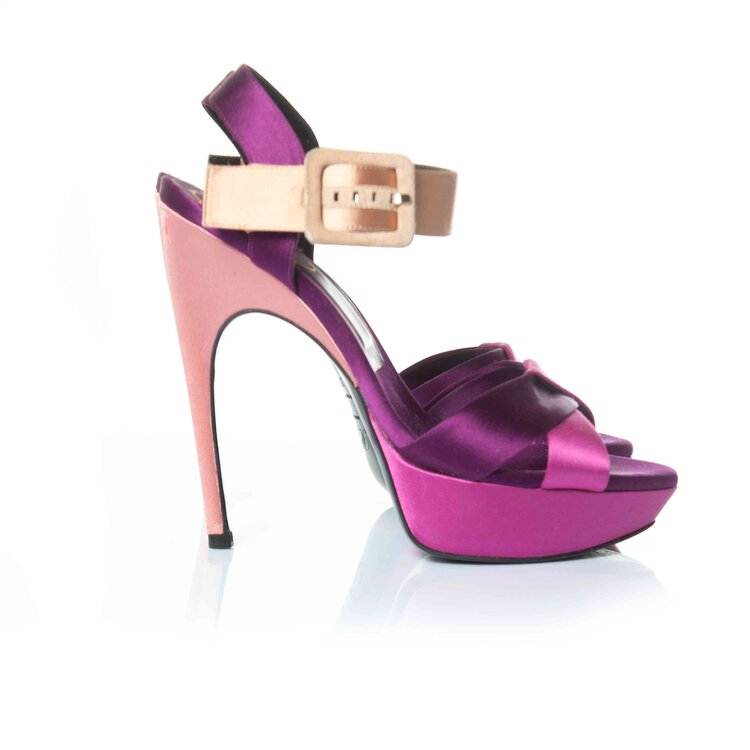 • Roger Vivier, Satin platform sandals in pink and purple. The item is in good condition with light signs of wear on the heels.