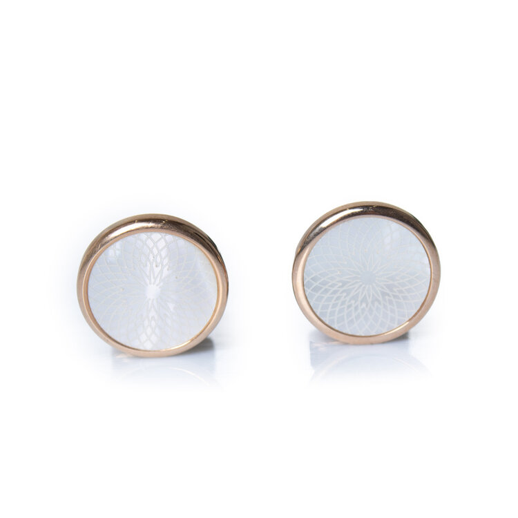 • RT London, gold and mother of pearl spiral printed cufflinks. The item is in very good condition.