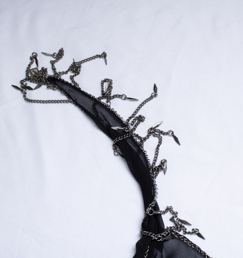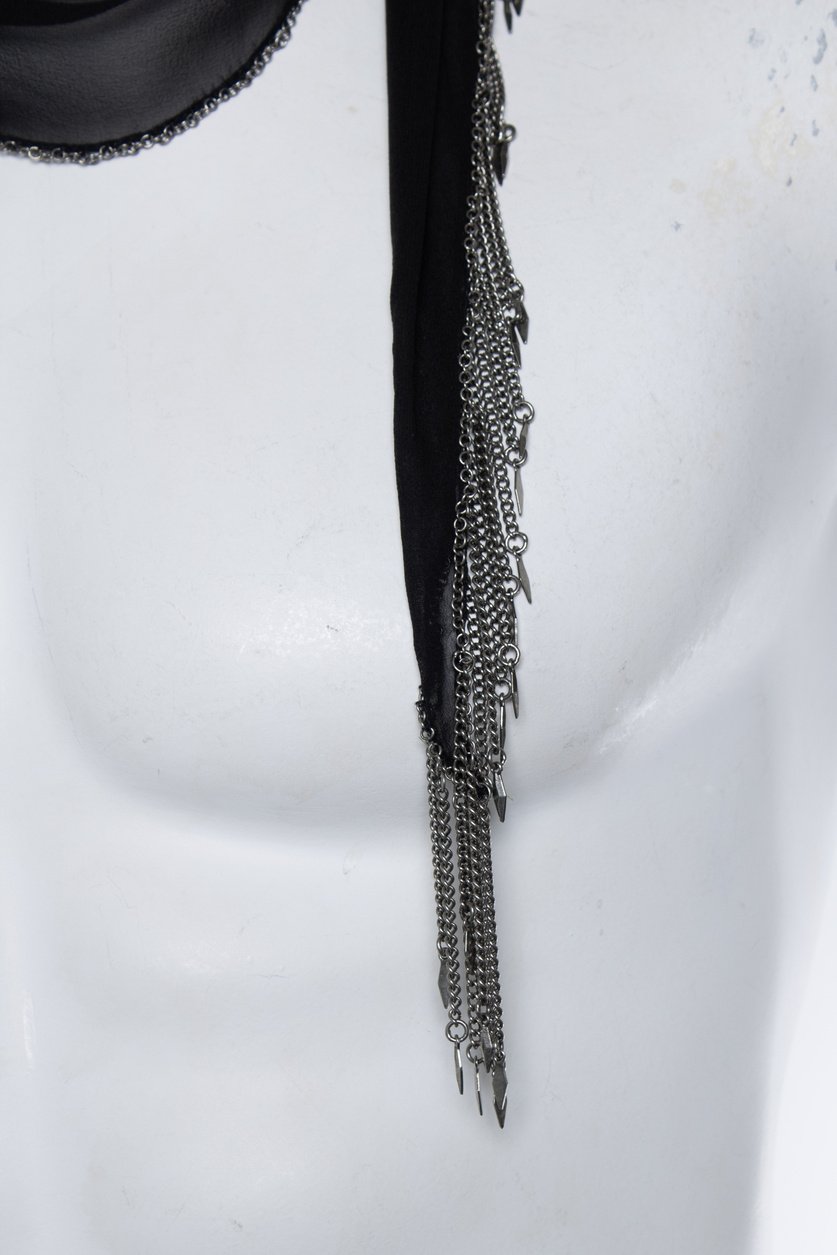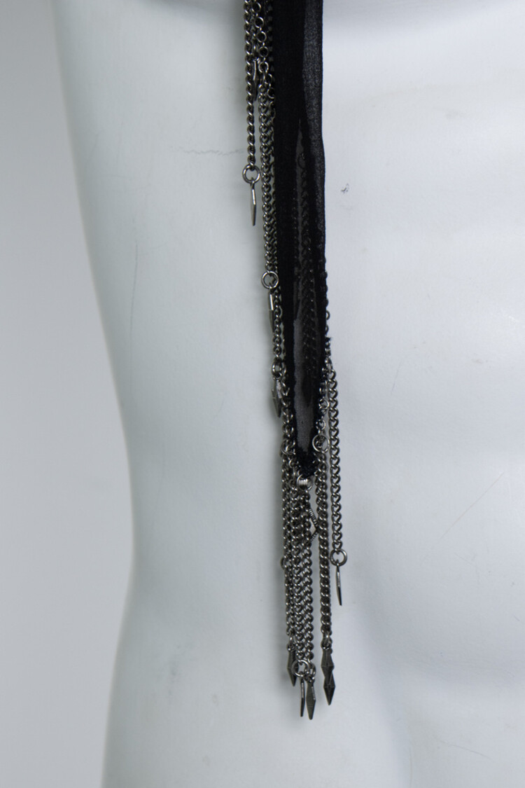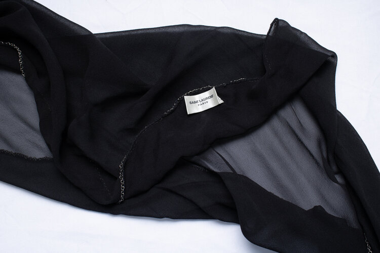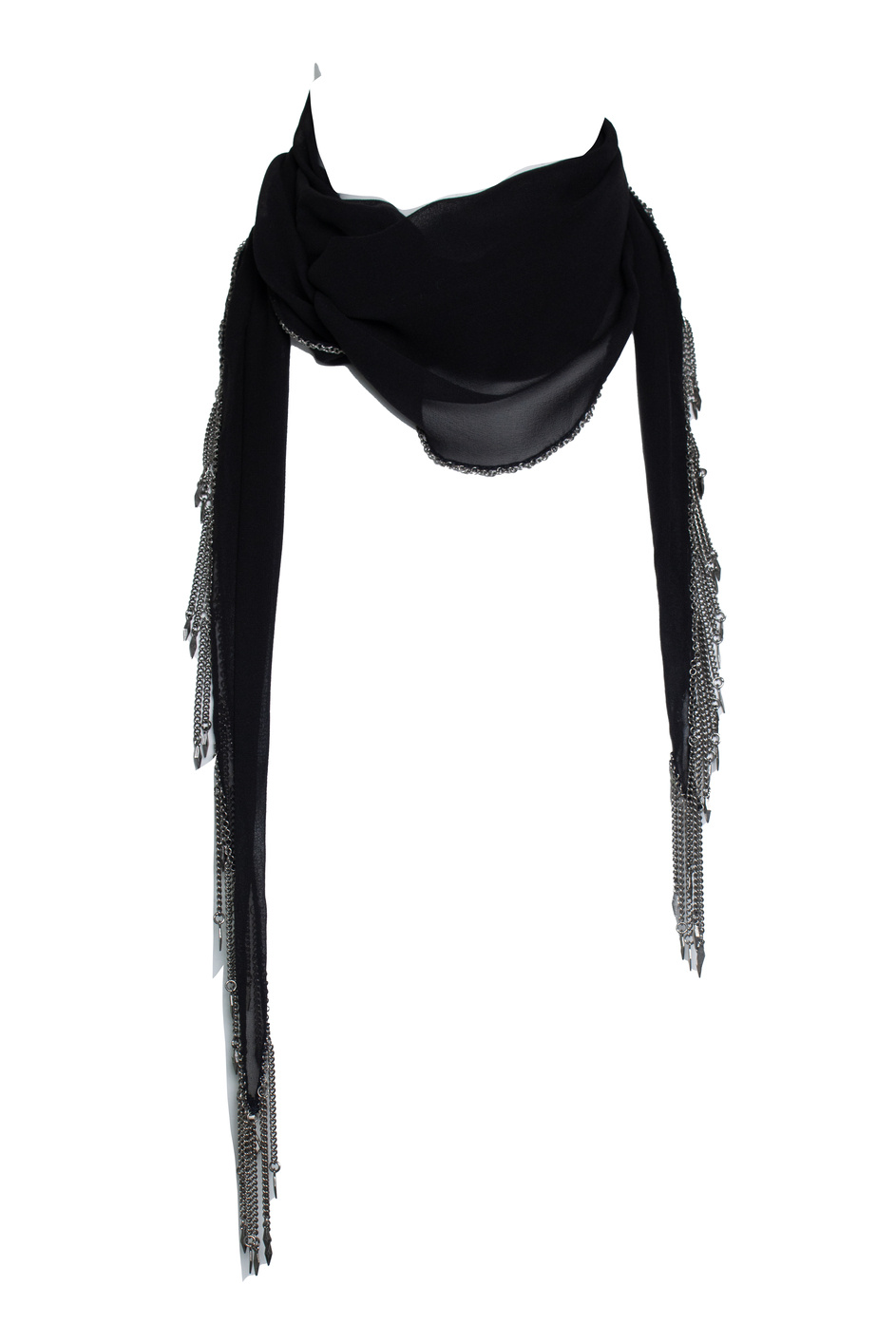 • Saint Laurent, Diamond shaped sheer scarf in black with metal fringes. The item is in very good condition.