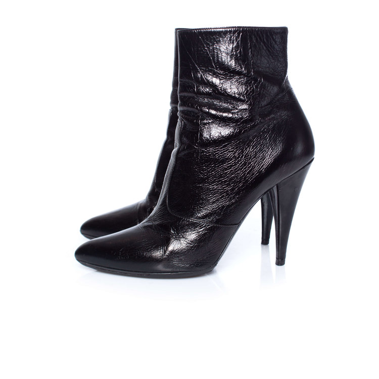 Saint Laurent, Black high shine leather Fetish zip ankle boots in size 38. Feature a pointed toe and sturdy heel. This item has been worn only once and has been reinforced on the sole after. Shows a few small signs of wear on both heels but is in very goo