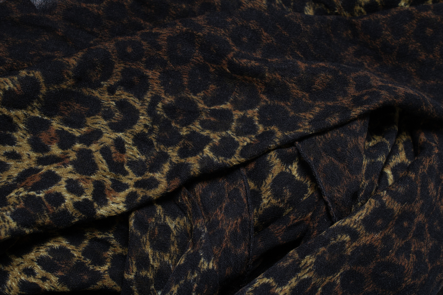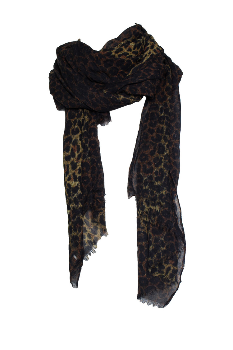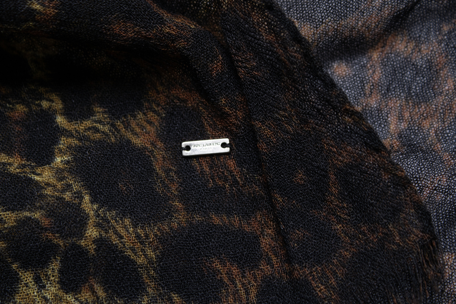 • Saint Laurent, leopard printed scarf in brown and khaki with raw fringes. The item is in very good condition.