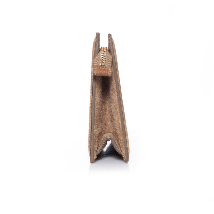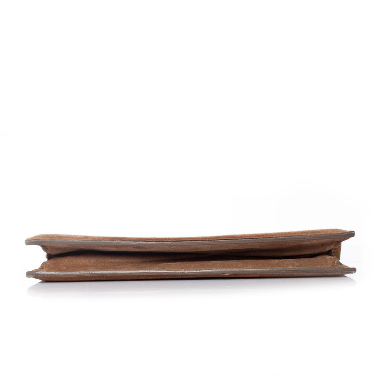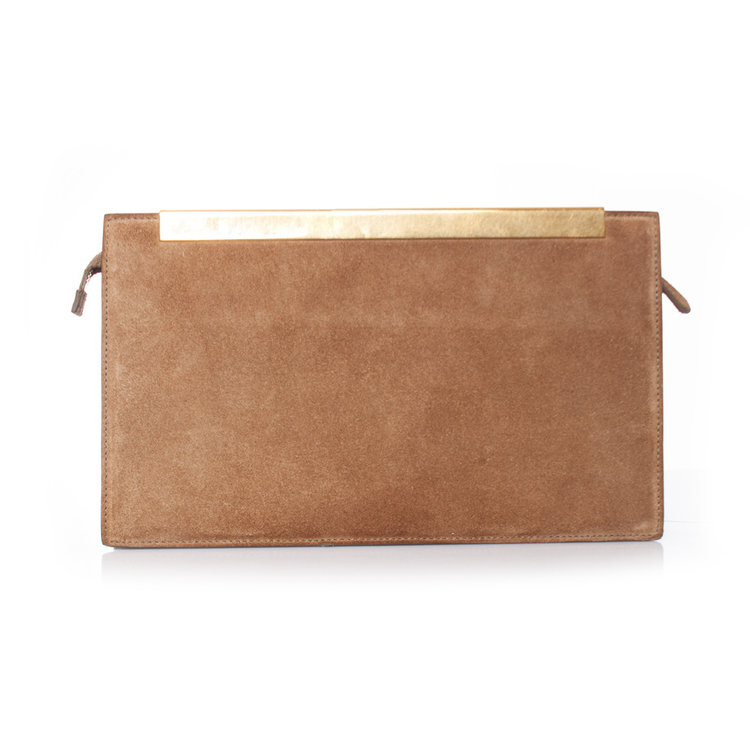 Saint Laurent, Sand colored clutch with gold bar. The item is in good condition with minor signs around the piping. Item comes with dustbag. Interior is in good condition.