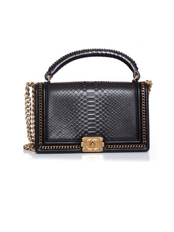 Chanel, Black python top handle leather boy bag with gold chain. The item is in very good condition. Item comes with Box, dust cloth for hardware, authenticity card, serial code and CITES papers. Inside flap has scratches further in very good condition.