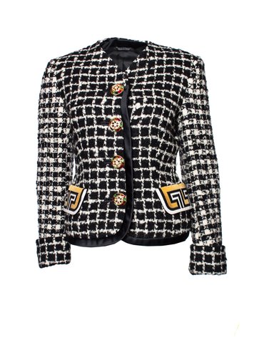 Gianni Versace Couture, Black and white boucle jacket. This Vintage piece features colourful crystal buttons and 2 stitch pockets with velvet print. The item is in very good condition, only the velvet on the pockets shows some light discoloration