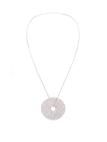 Necklace in 18 kt white gold with round pendant with 13 rows of 0.8 kt diamonds. The pendant has a diameter of 4.1 cm. The stones have a size of 0.5 mm. Brand of the necklace is unknown. Necklace has a beautifully smooth surface due to the micro pave sett