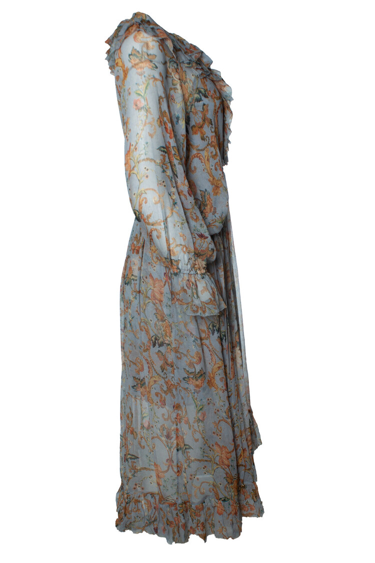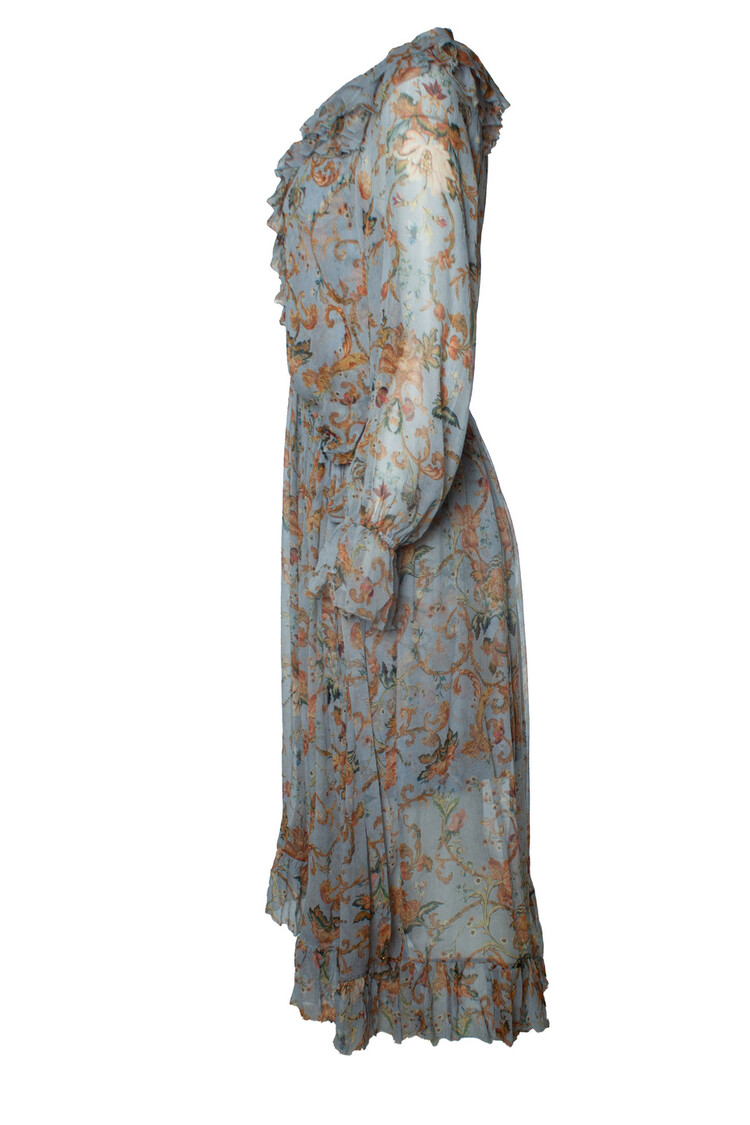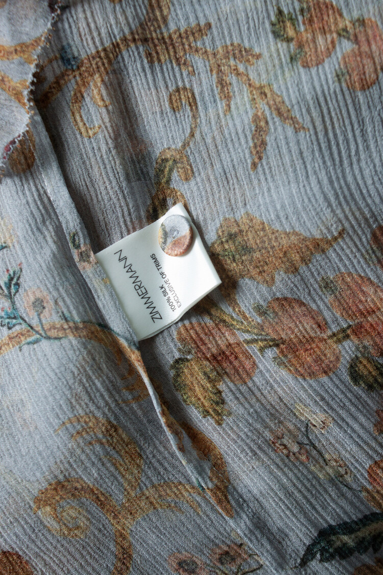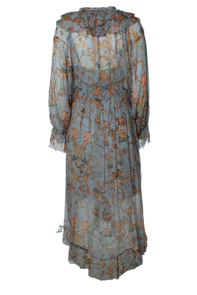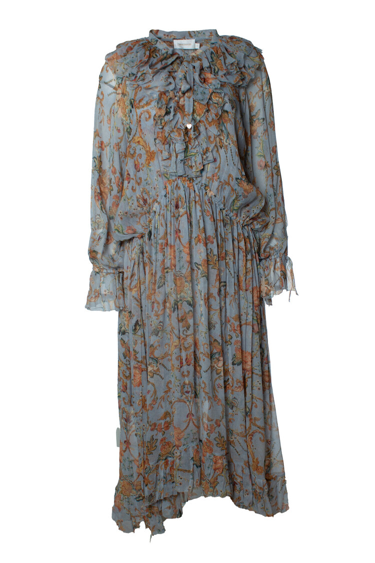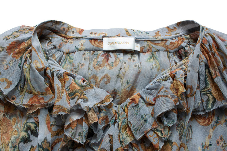 • Zimmermann, grey floral printed ruffled trim maxi dress. The item is new - unworn. Comes with slip dress