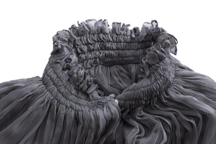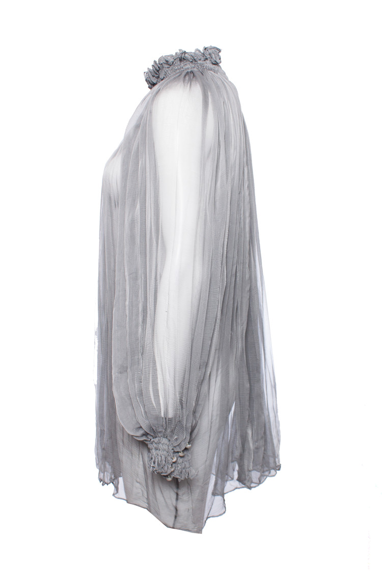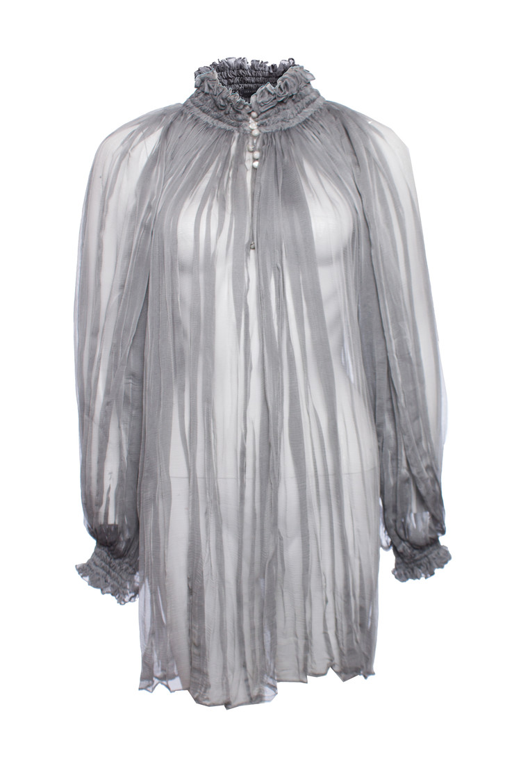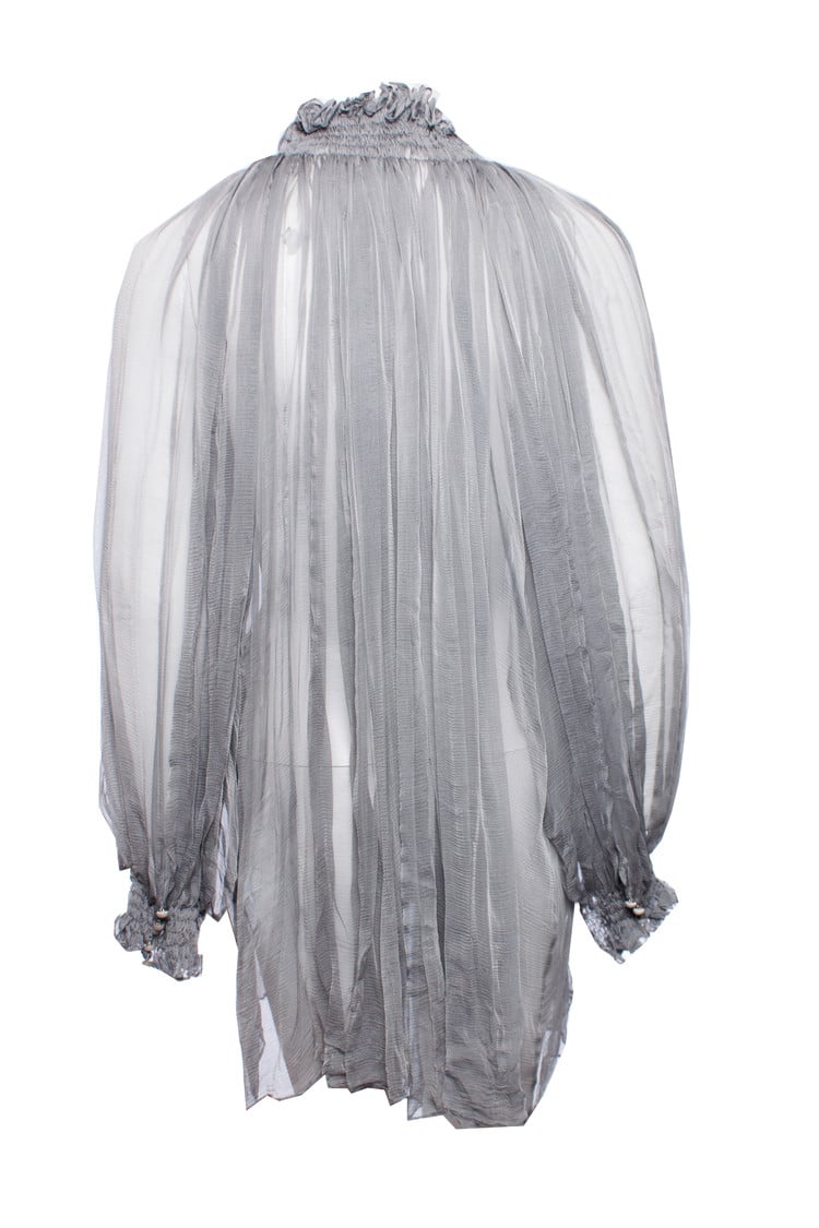 • Alexander McQueen, Grijs transparante romantische bloes met parelmoer knoopjes in maat M. Het item is in uitstekende conditie.