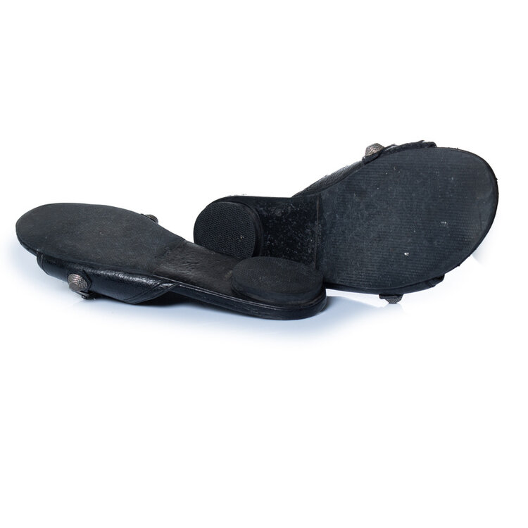 • Balenciaga, instapsandalen met gigantische zilveren studs. Het artikel verkeert in goede staat, de zool is verstevigd.
