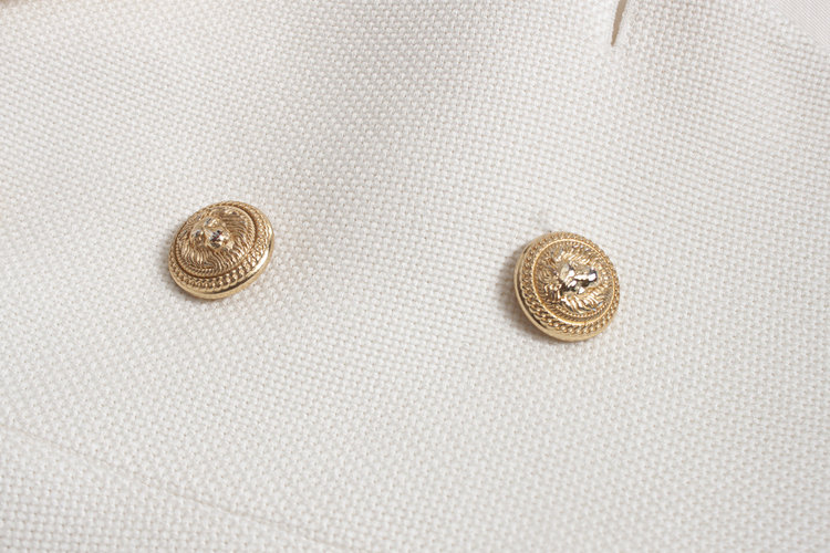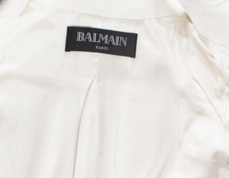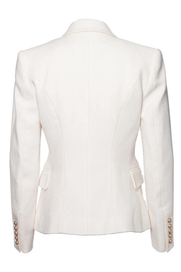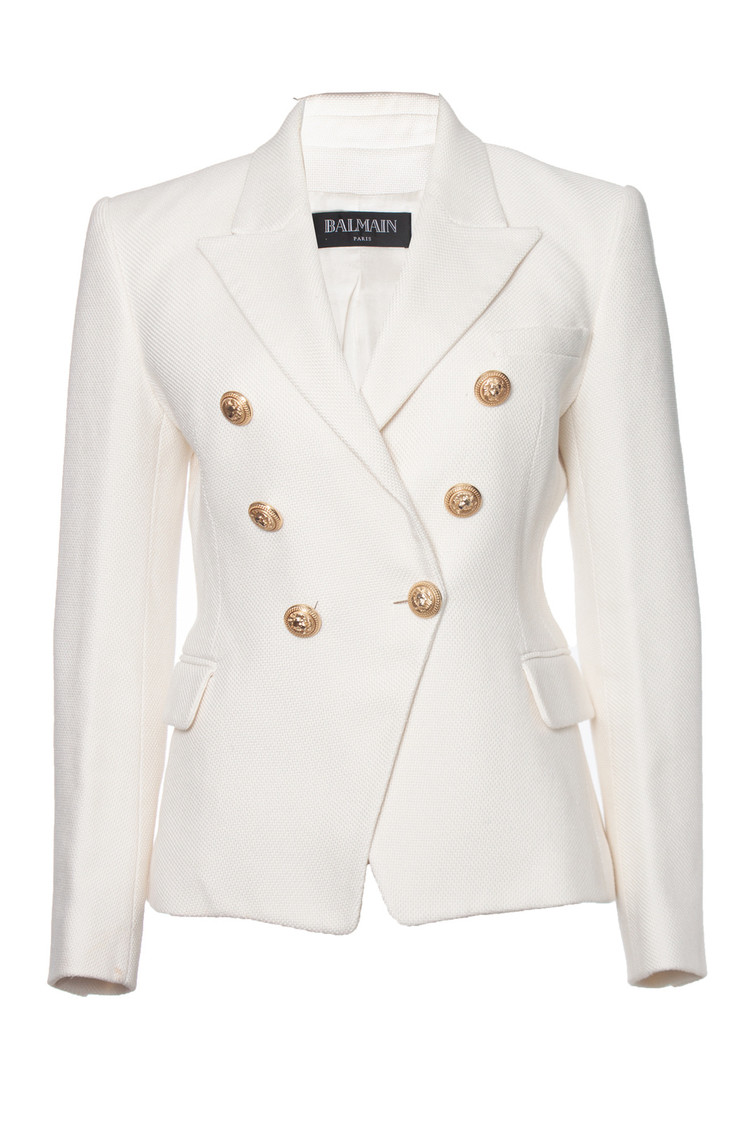 • Balmain, Dubbel knoops katoenen witte blazer. Dit item heeft een klein vlekje aan de binnenkant van de rechtermouw en rechtsachter verder in goede staat.
