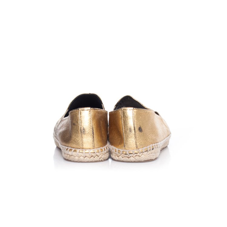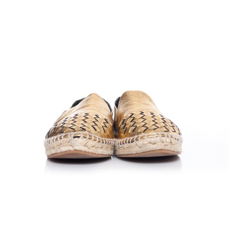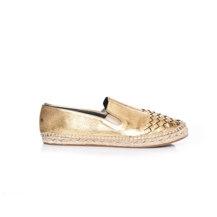 Deze zachte espadrilles van nappa worden traditioneel met de hand gemaakt in Spanje. Het klassieke ontwerp wordt gekenmerkt door de gewoven-details op de punt en een verfijnde metallic tint. De gevlochten jutezool heeft een rubberen basis voor grip. Tone-on-tone stretch-inserts maken dit schoentje nog comfortabeler om te dragen.