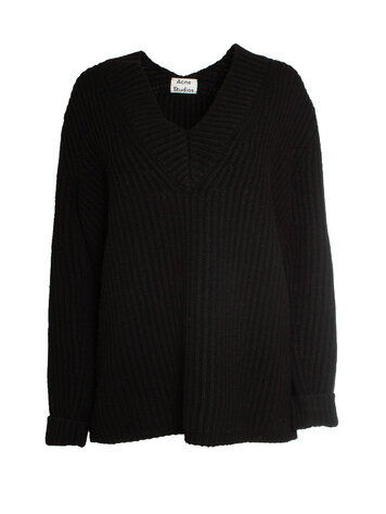 Acne Studios, Geribbelde gebreide v-hals trui in het zwart. Het artikel is in goede staat.