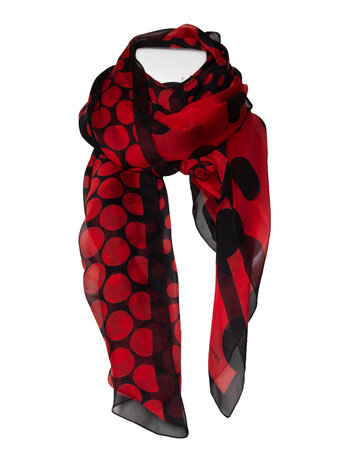 Dries van Noten, zijden doorschijnende sjaal met stippen in zwart en rood. Het artikel verkeert in zeer goede staat.