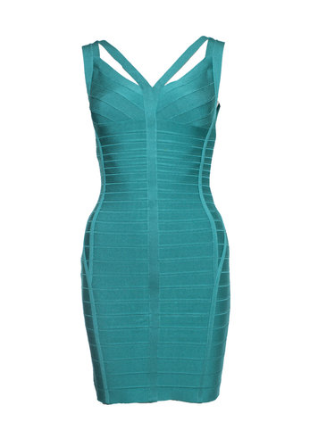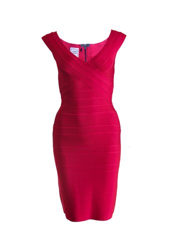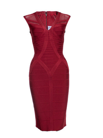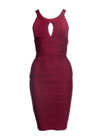 Herve Leger, bordeauxrode bandagejurk. V-hals, mouwloze, racerback-achtige ritssluiting aan de achterkant, reikt tot over de knie. Dit item is in goede staat.
