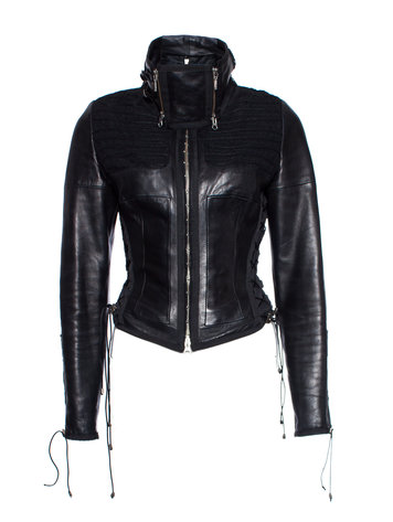 Jitrois, Leren biker jack met corset sluiting en hoge kraag in maat IT42/S. Het item is gedragen maar is in goede staat (mist alleen 2 of 3 zilveren bolletjes aan de armen).