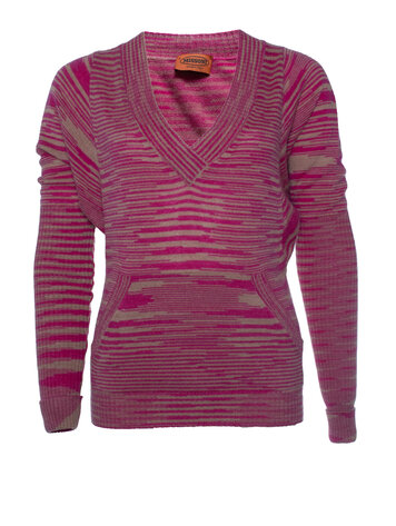 Missoni, gestreepte trui met vleermuismouwen en kangoeroezak in roze en beige. Het item is in goede staat.