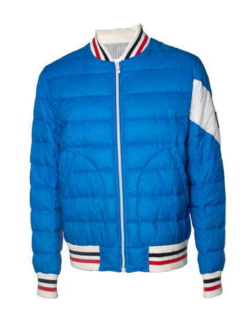 Moncler, Gamme bleu shell donsbomberjack. Het item is in goede staat met lichte verkleuring op de witte geribbelde delen in de hals en uiteinde van de mouwen.