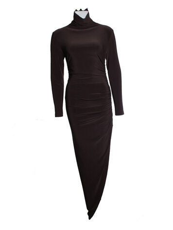 Norma Kamali, bruine maxi-jurk met col. Het artikel verkeert in zeer goede staat.