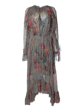 Zimmermann, grijze maxi-jurk met bloemenprint en ruches. Het artikel is nieuw - ongedragen. Wordt geleverd met onderjurk
