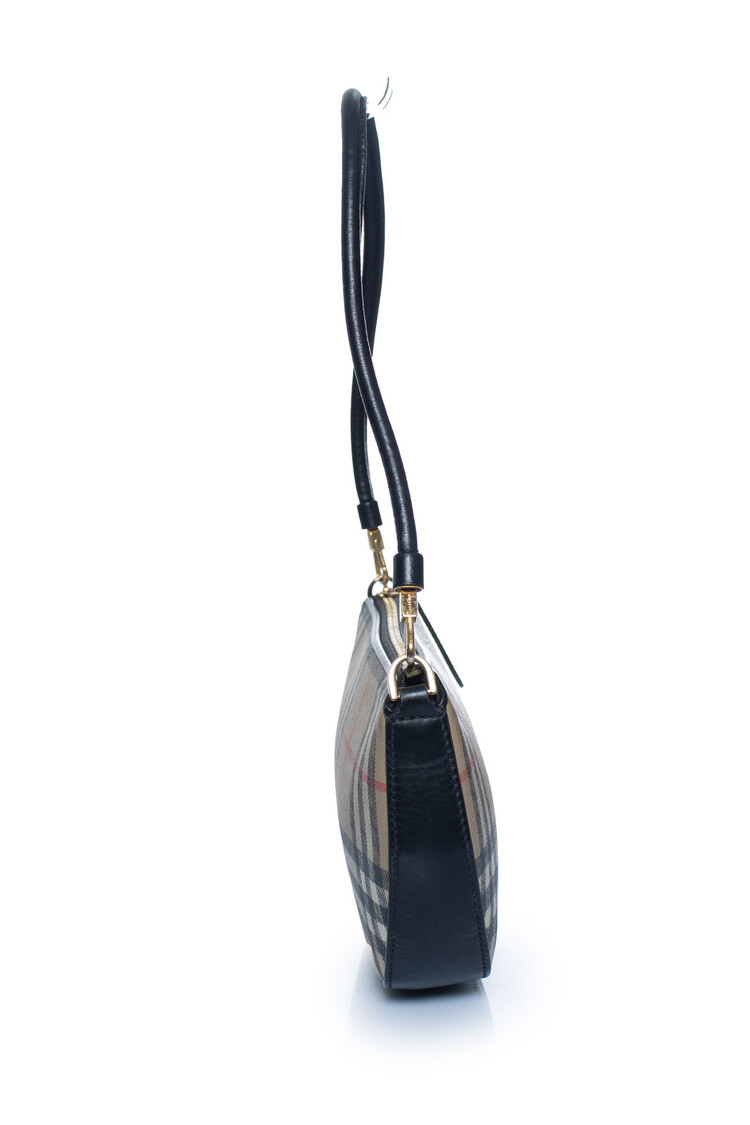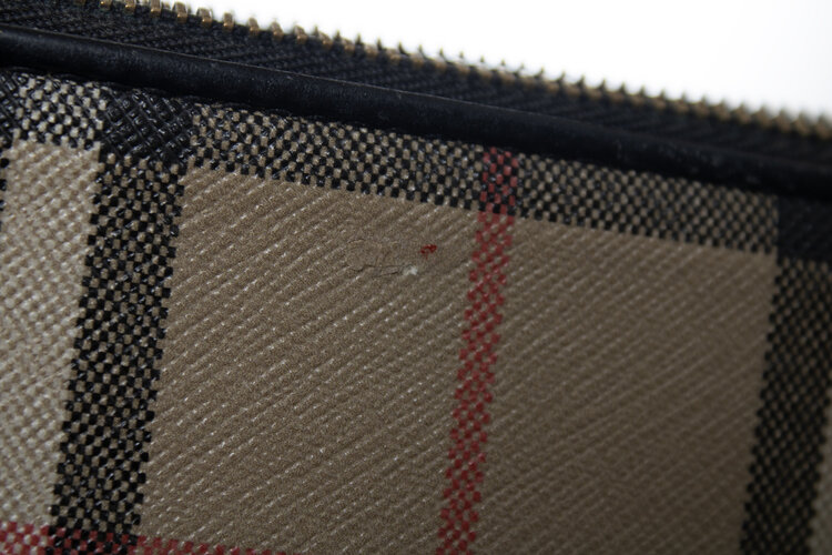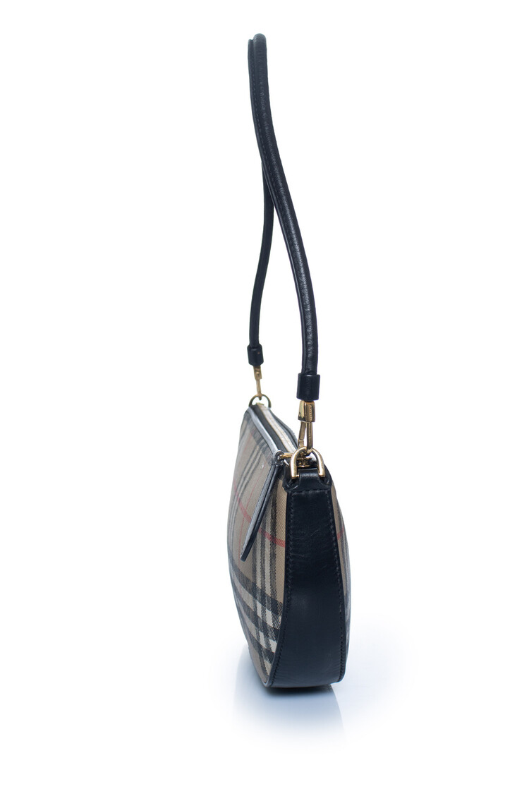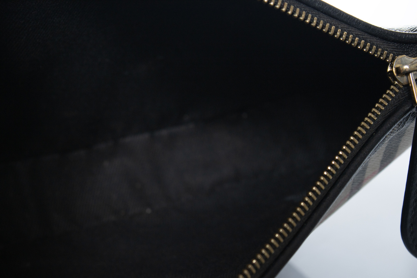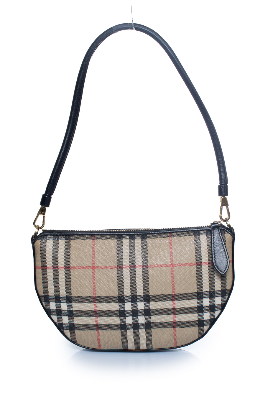 Burberry Olympia Nova schoudertas met ruitpatroon in bruin. De tas is in goede staat, met een kleine beschadiging aan het canvas op de achterkant. Aan de binnenkant zitten enkele make-upvlekken.