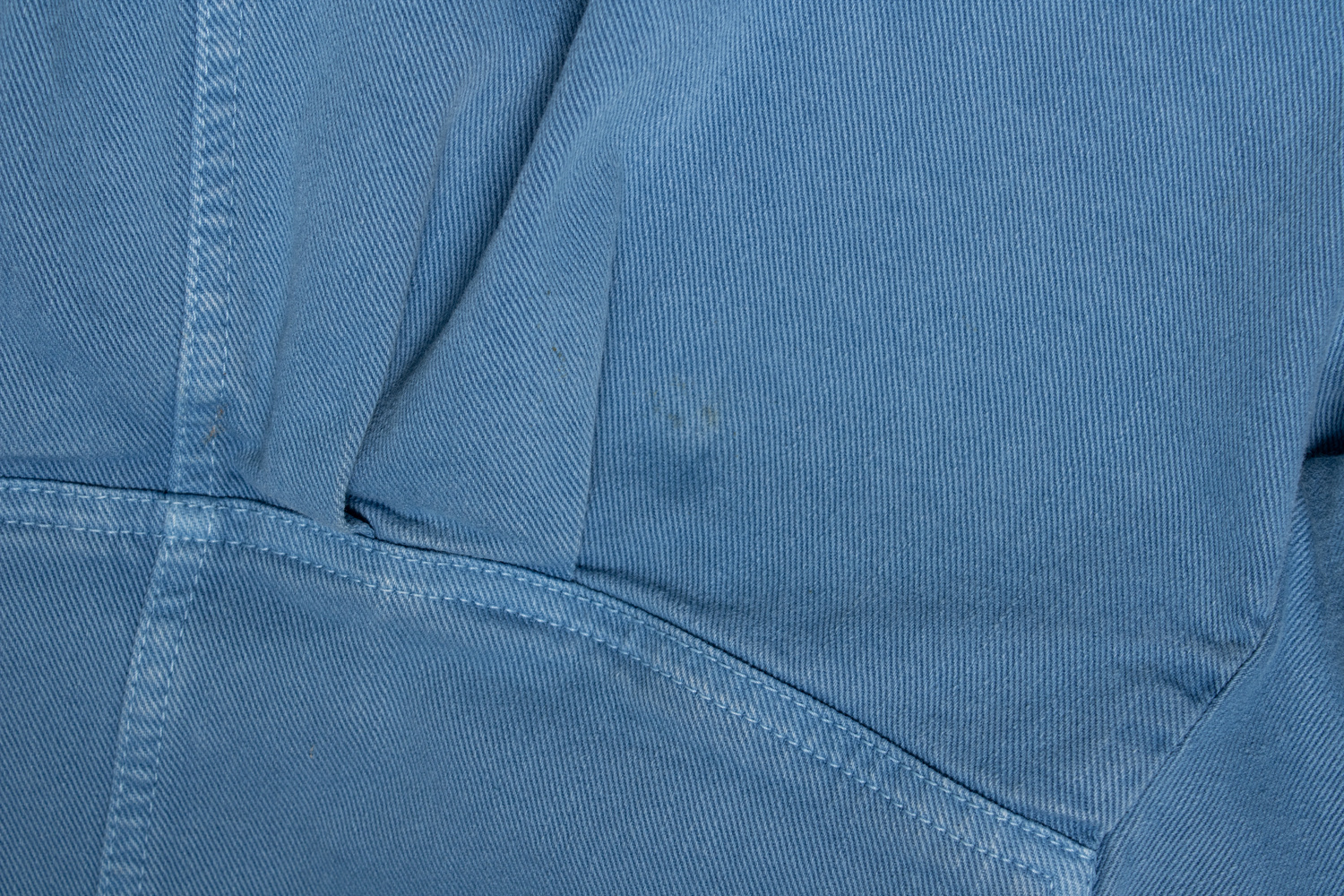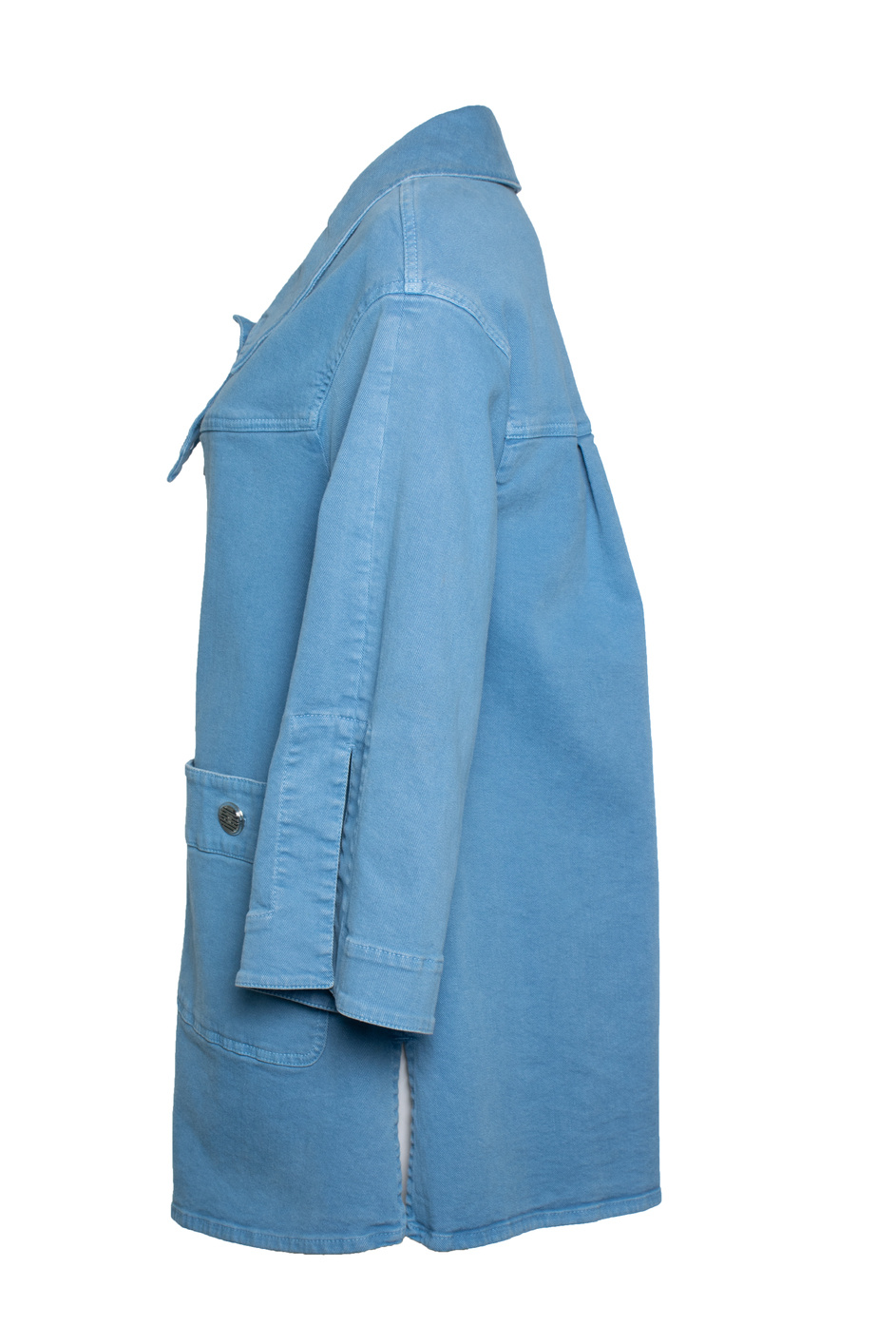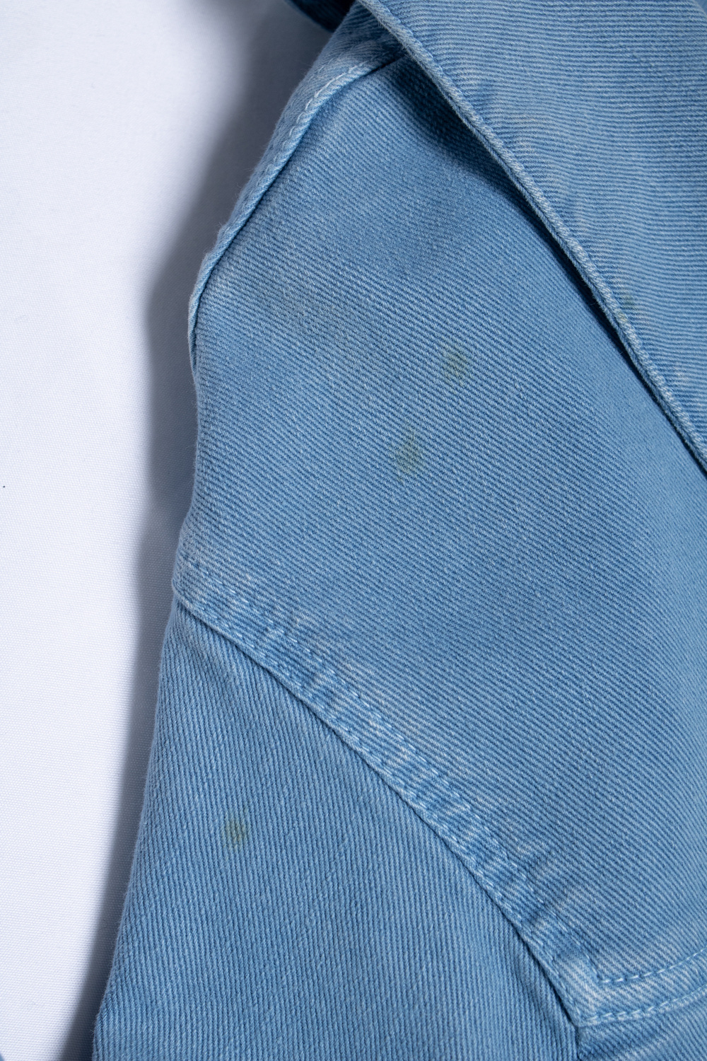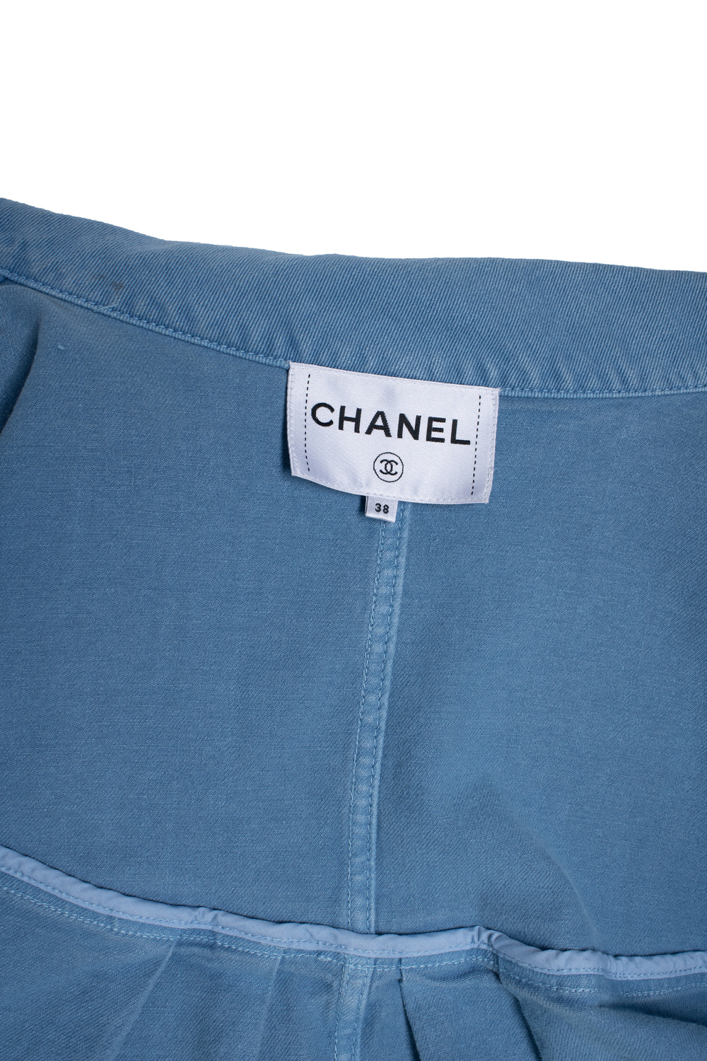• Chanel, 17S denim jas in blauw. Het artikel heeft 3 vlekken (op de rechterschouder) en verkeert verder in goede staat.