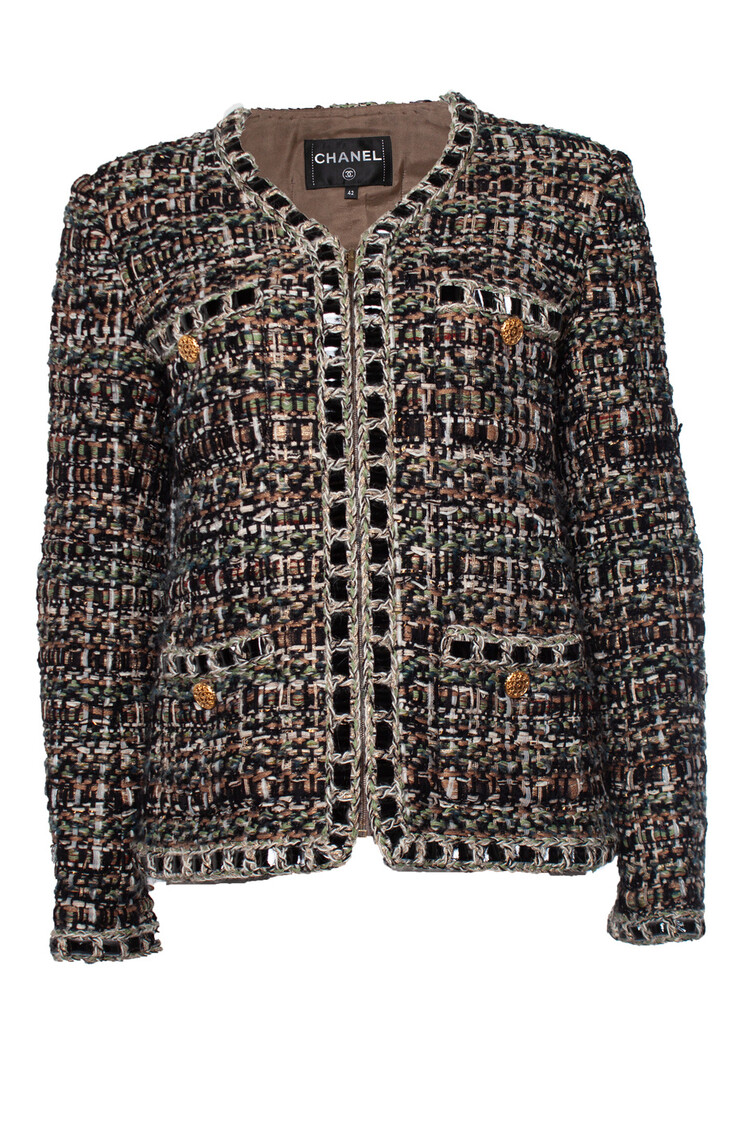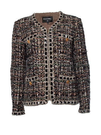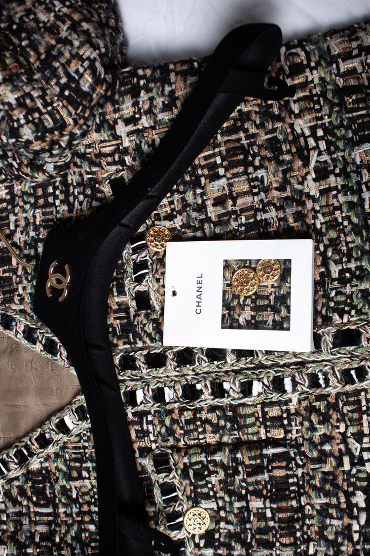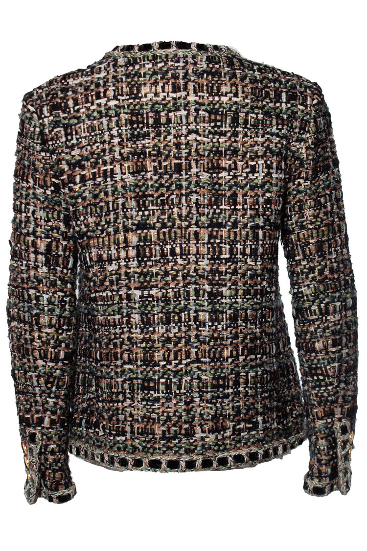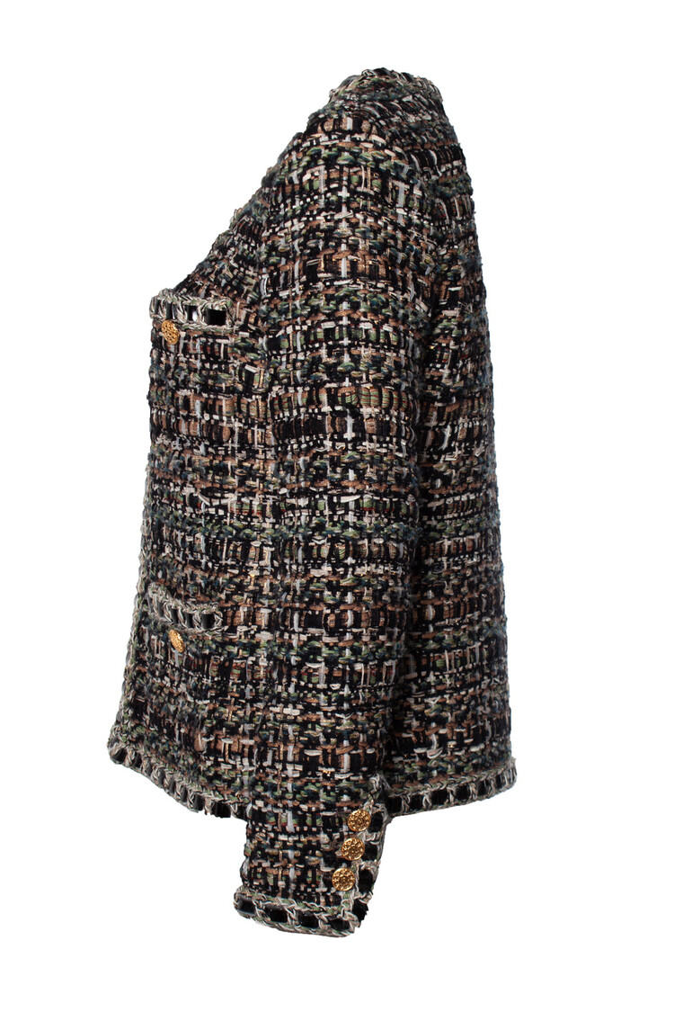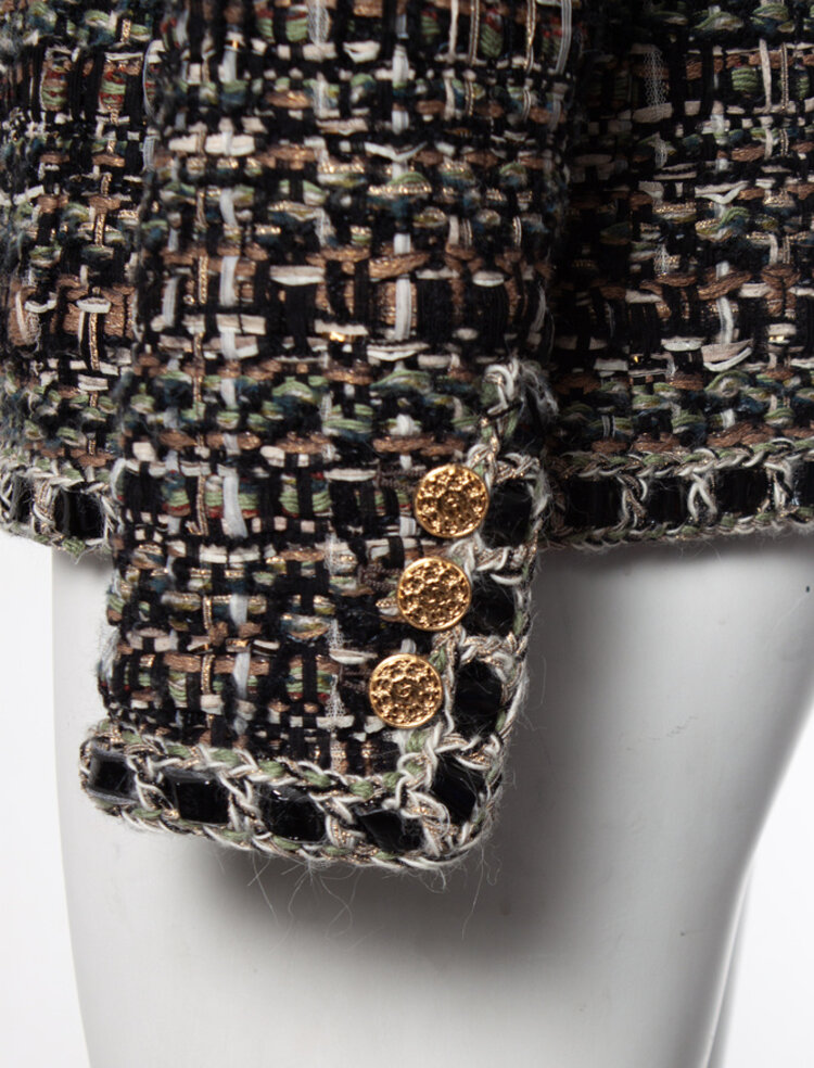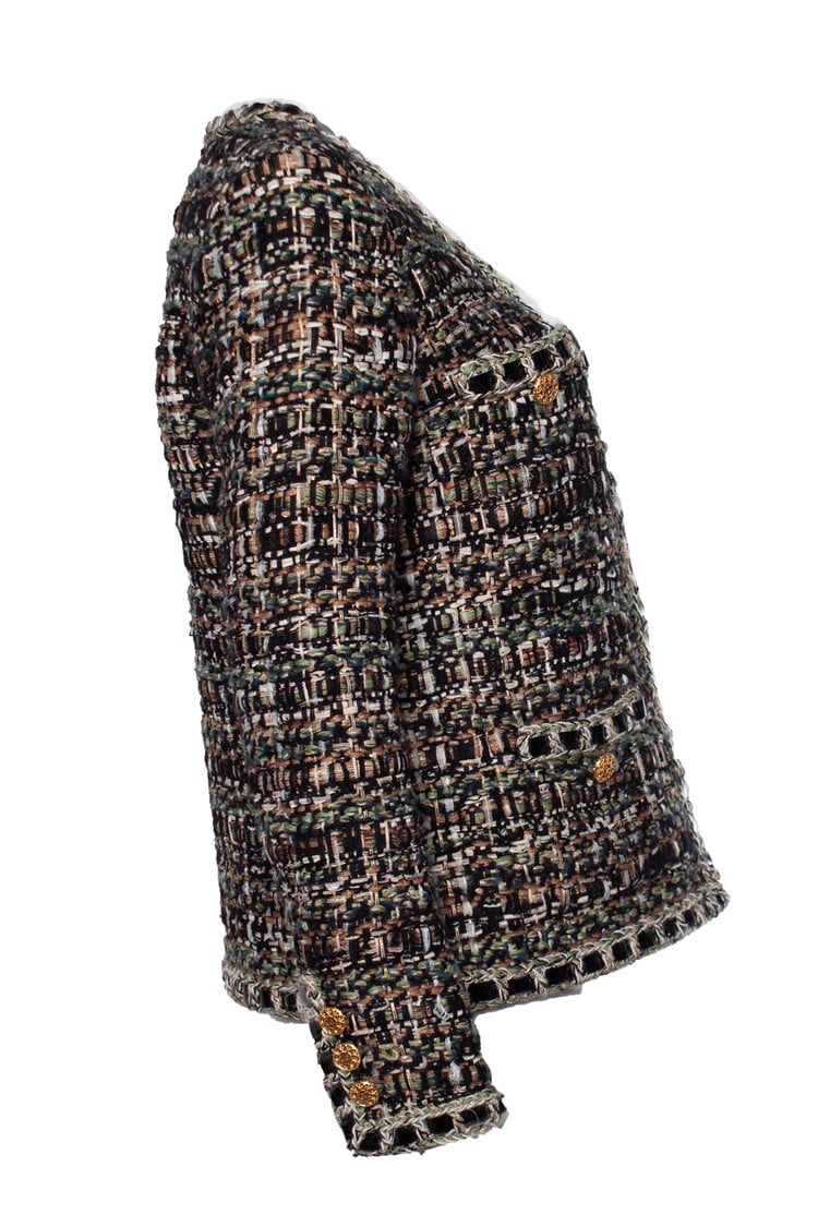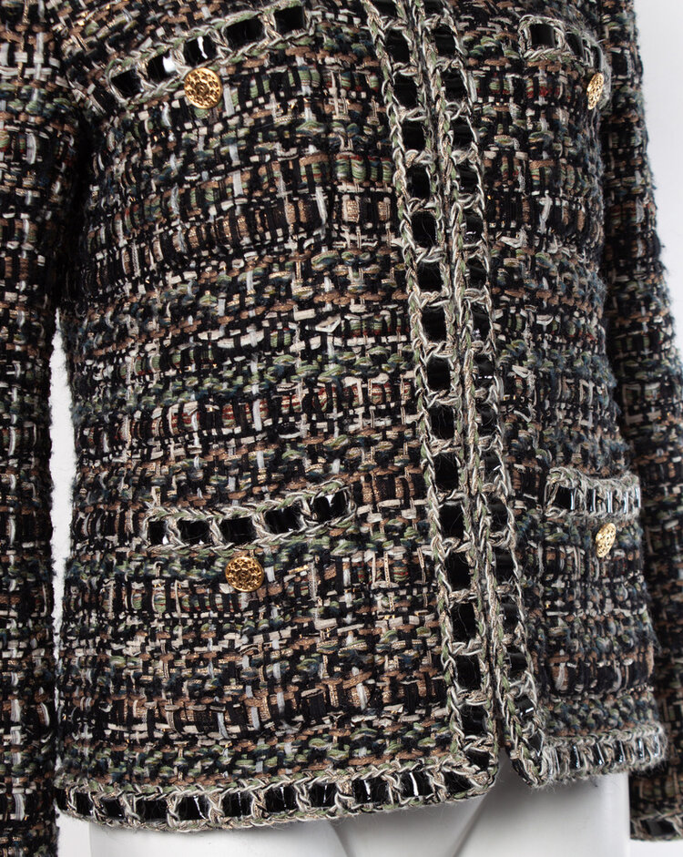 Chanel, 16A Paris-Rome fantasy-collectie 4-pocket veelkleurig tweed jasje met lakleren afwerking en gouden CC-knopen. Het artikel verkeert in zeer goede staat. Komt met extra knopen.