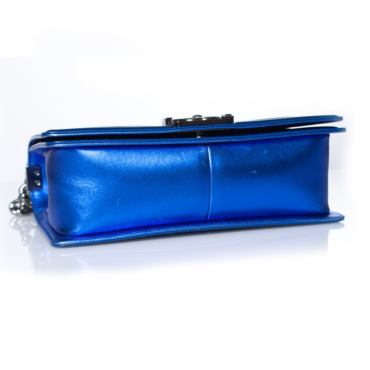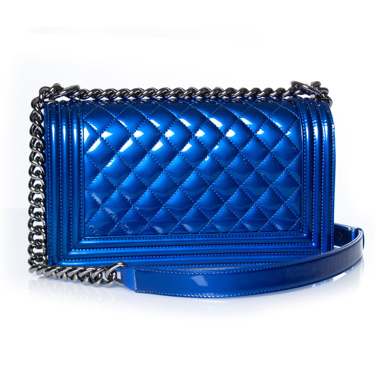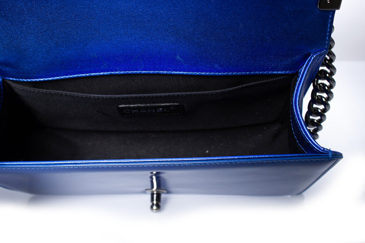 Chanel, Old medium boy bag in metallic blauw lakleer. Het item is nieuw - ongedragen en wordt geleverd met doos, dustbag, bon, authenticiteitskaart, boekje en stofdoekje. Item heeft een paar krassen op het metallic leer. (Onder en binnen)