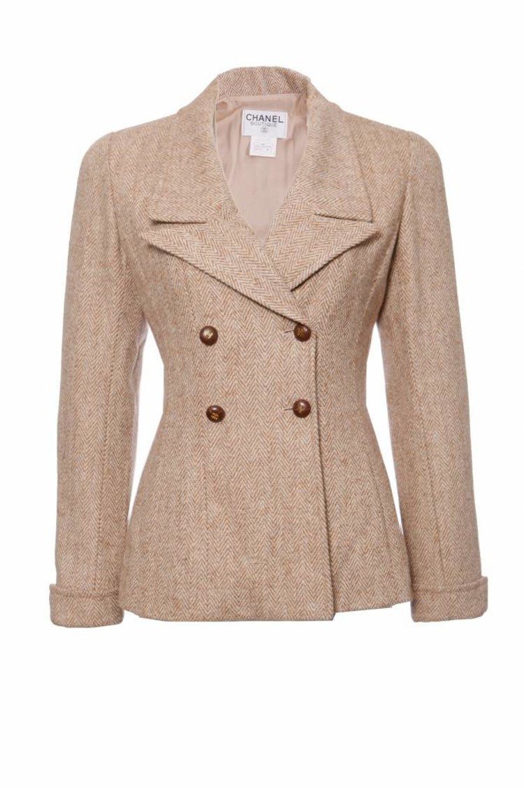 Chanel Boutique, briek kleurige vintage colbert jasje in bouclé. Het product is in zeer goede staat. De originele knopen zijn in perfecte staat. Een must voor Chanel liefhebbers. Een bijpassende rok is ook beschikbaar.