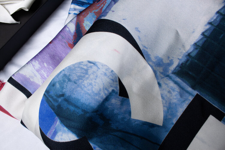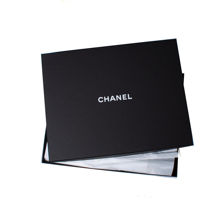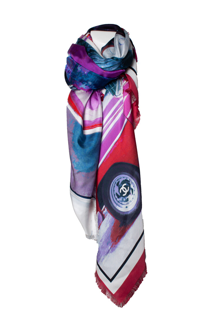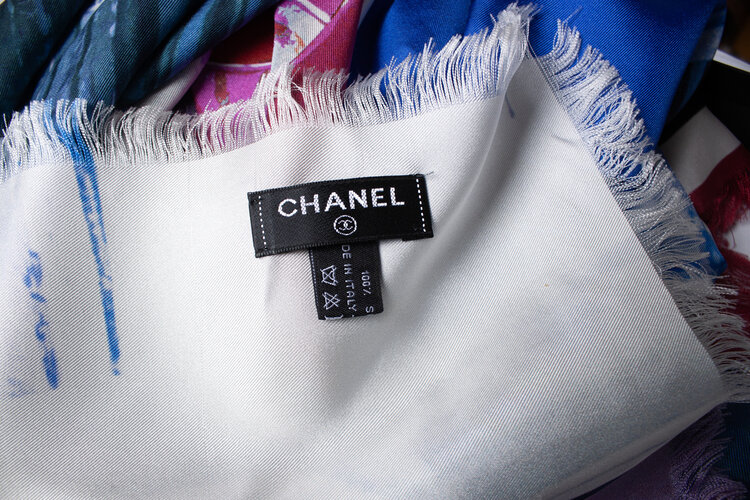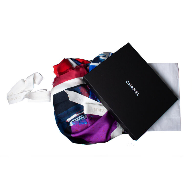 • Chanel, Havana-sjaal. Het artikel verkeert in goede staat. Eén klein vlekje op de letter C. Wordt geleverd met doos en linten.