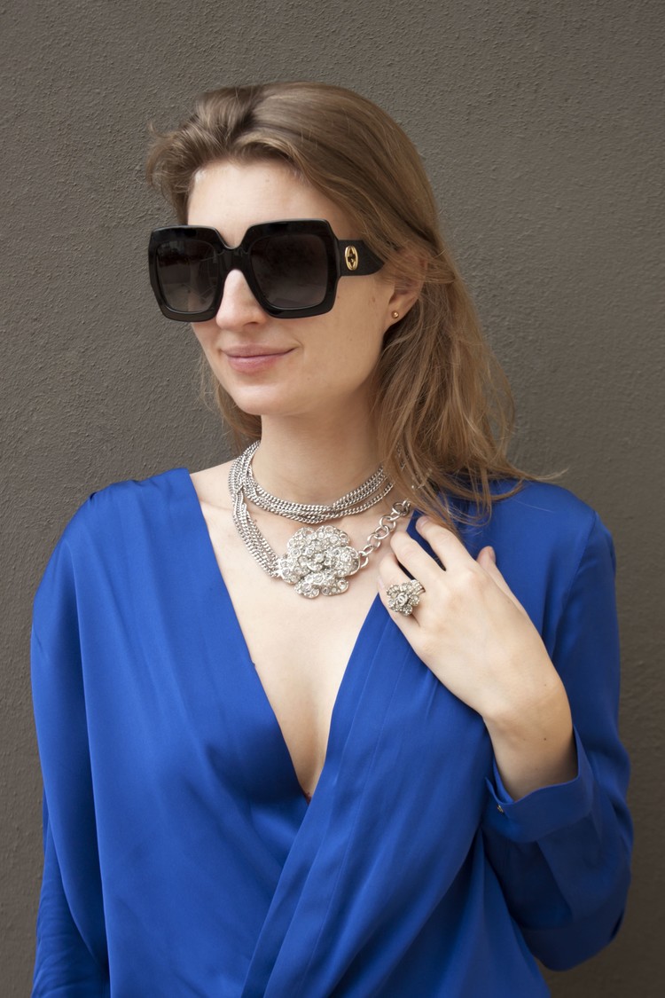 Vier zilverkleurige schakelkettingen versierd met een weelderige kenmerkende chanel bloem volledig bezaaid met gefacetteerde heldere steentjes/kristallen. De druppel is voorzien van CC-logo met heldere strass steentjes bevestigd aan een ketting gemaakt van 9 in elkaar grijpende cirkels.
