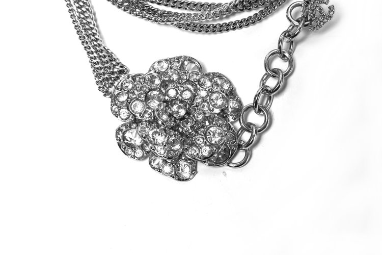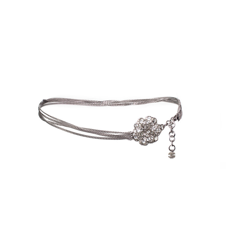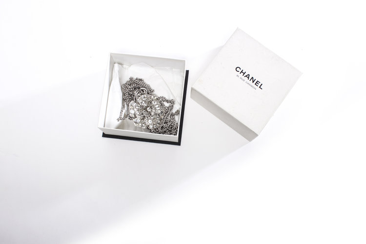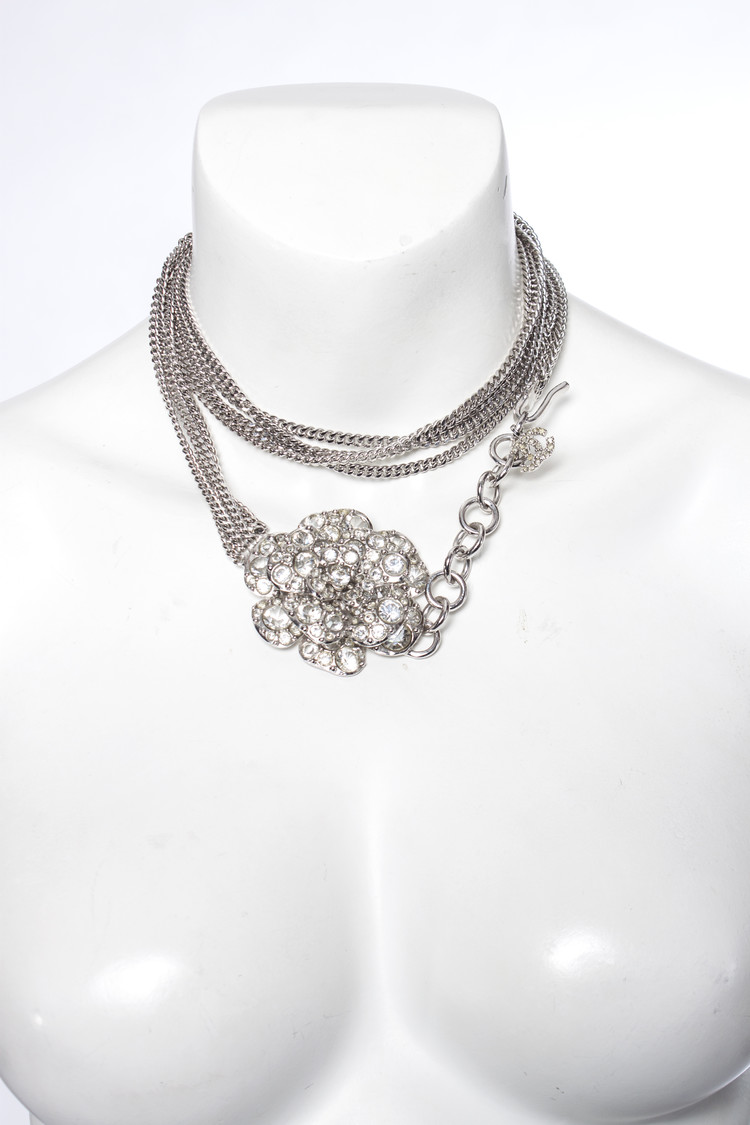 Vier zilverkleurige schakelkettingen versierd met een weelderige kenmerkende chanel bloem volledig bezaaid met gefacetteerde heldere steentjes/kristallen. De druppel is voorzien van CC-logo met heldere strass steentjes bevestigd aan een ketting gemaakt van 9 in elkaar grijpende cirkels.