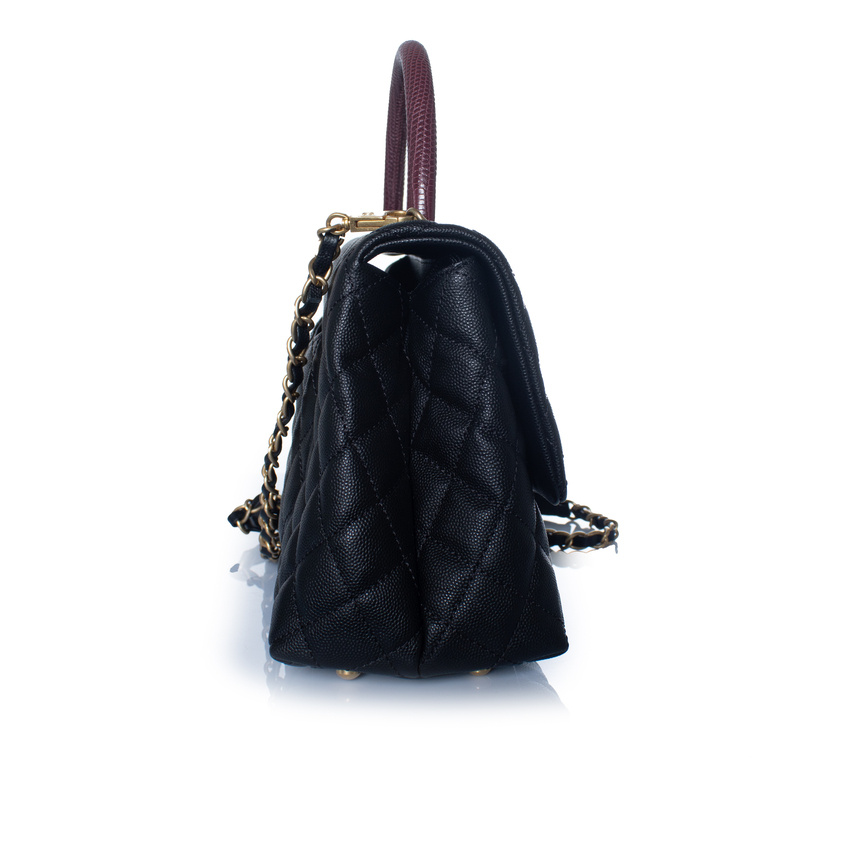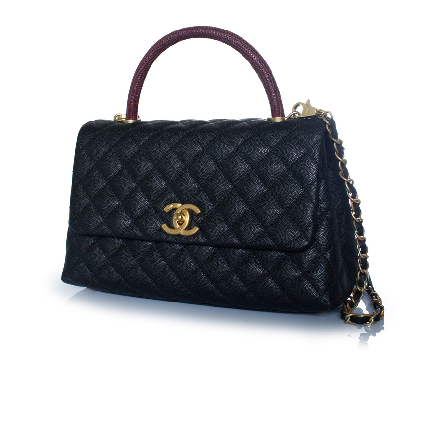 • Chanel, tas met handvat van zwart kaviaarleer en hagedissenhengsel in bordeauxrood. Het artikel verkeert in zeer goede staat en wordt geleverd met doos, stofzak, kaartje en serienummersticker. De pootjes en hoeken vertonen zeer lichte gebruikssporen.