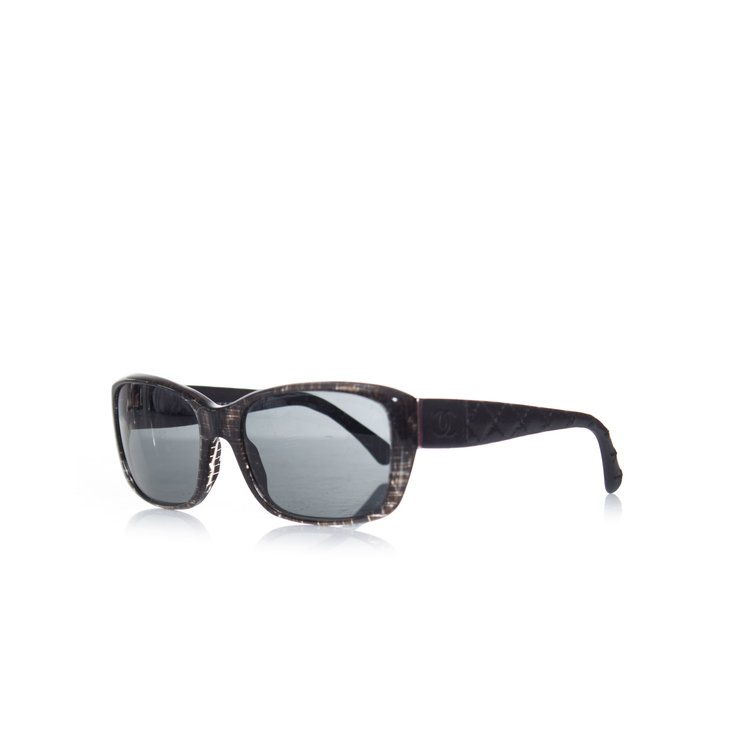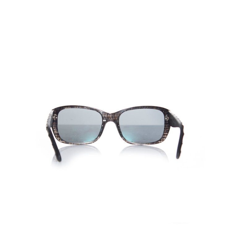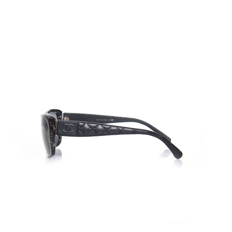 Chanel, zwart glitter frame en leren gewatteerde zonnebril.