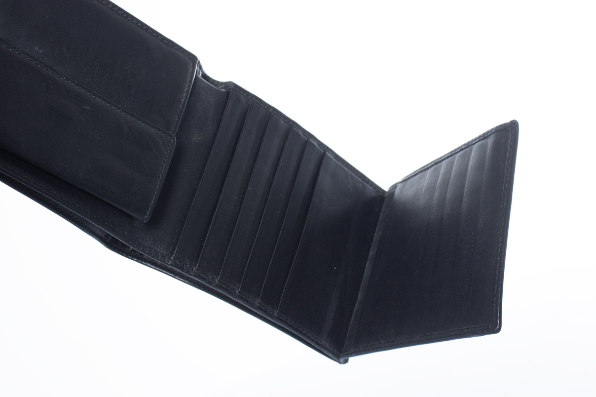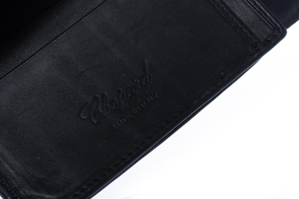 • Chopard, zwarte leren portemonnee. Het item is in goede staat. Enkele rimpels en krasjes op het leer en wat slijtage aan de hoeken.
