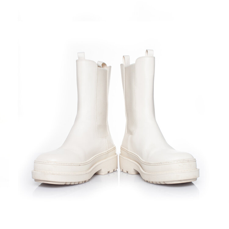 Christian Dior, gebroken witte Trial enkellaarzen. Het artikel verkeert in goede staat. Rechterlaars heeft enkele krasjes op het leer en rubberen zool heeft enkele gebruikssporen. Elastisch gedeelte heeft een paar hele lichte vlekjes
