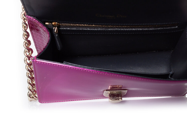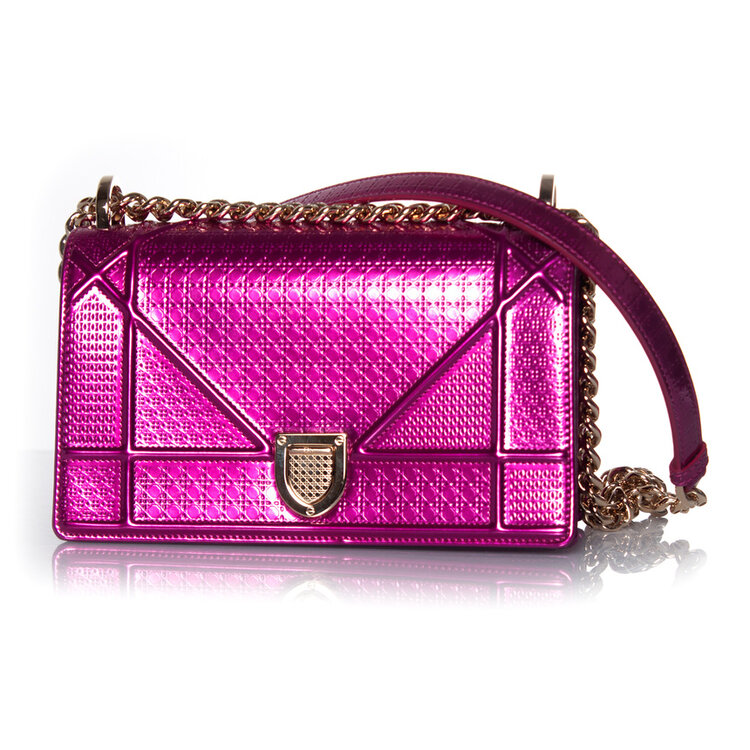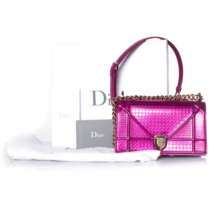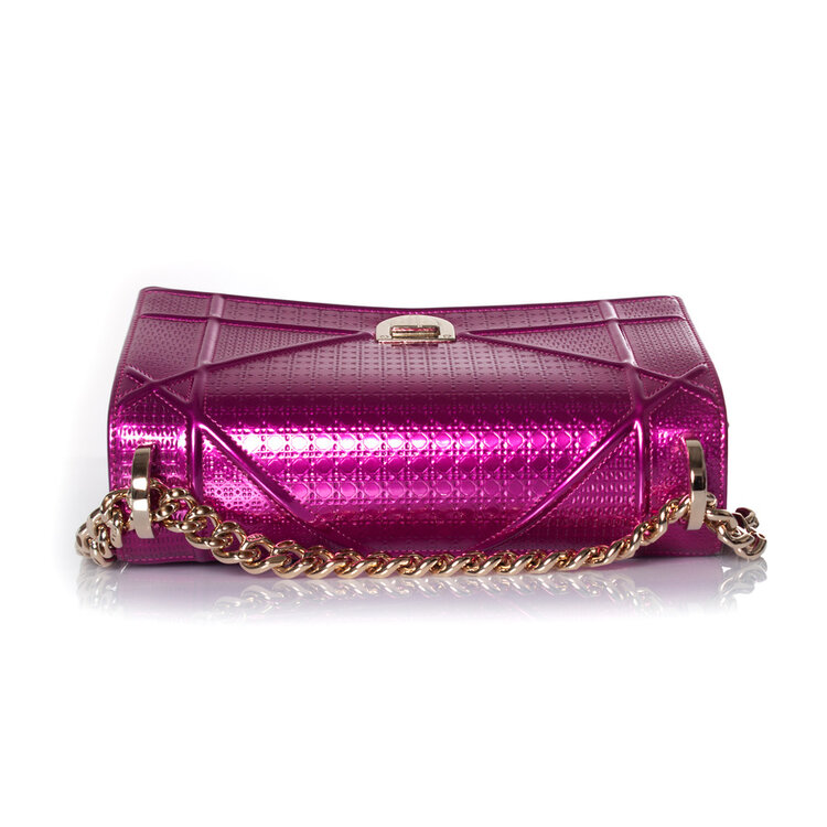 Christian Dior, metallic kleine Diorama-flaptas met cannage-reliëf, van fuchsiakleurig lakleer. Dit item is in uitstekende staat en wordt geleverd met bon, stofzak, kaart, boekje en doos.