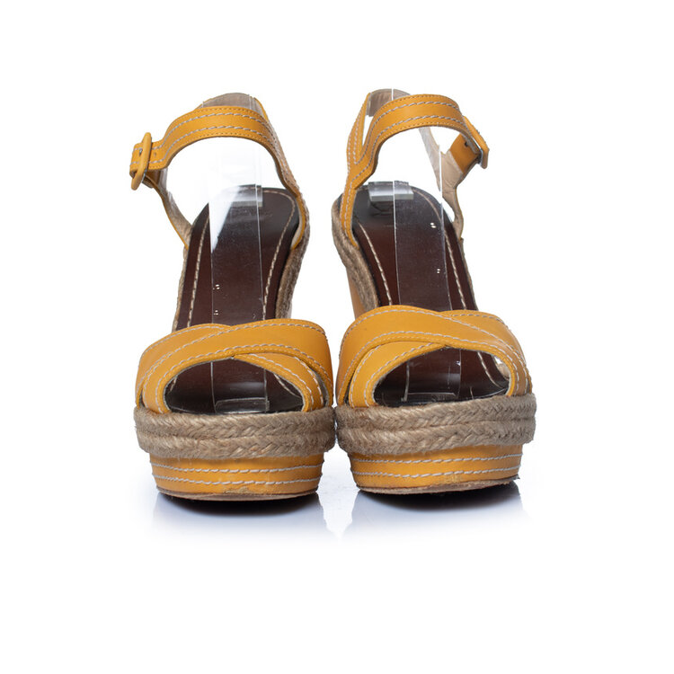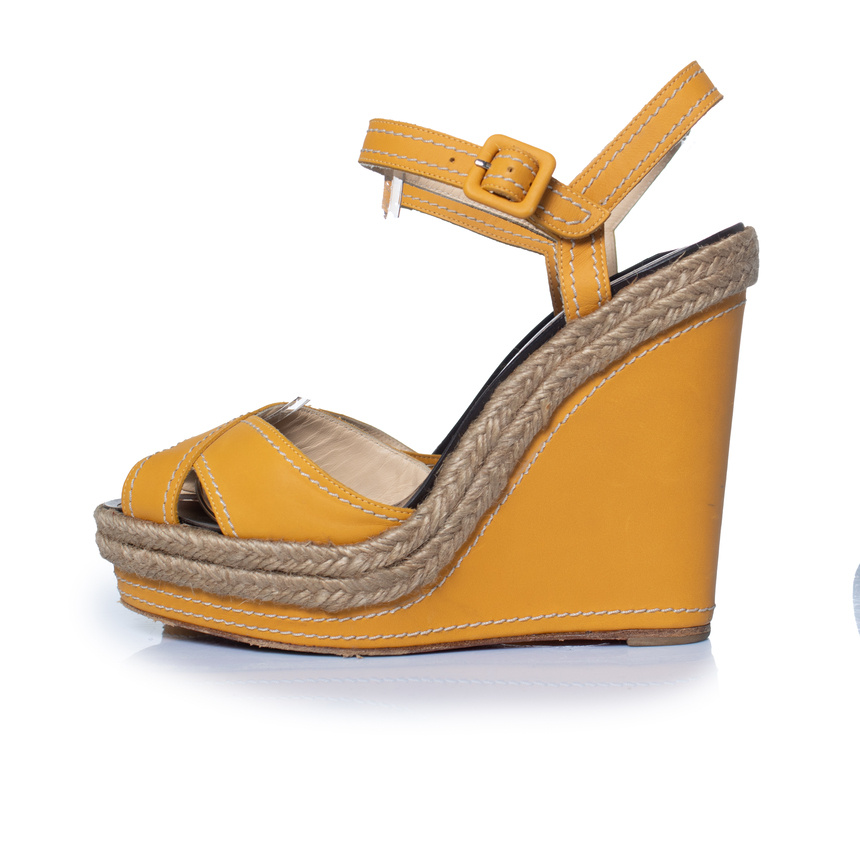 • Christian Louboutin, leren sandalen met sleehak in okerkleur. Het artikel heeft lichte krasjes op het leer, verder in goede staat.