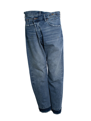R13, Crossover jeans in blauw met gouden verfspatten. Het artikel verkeert in zeer goede staat.