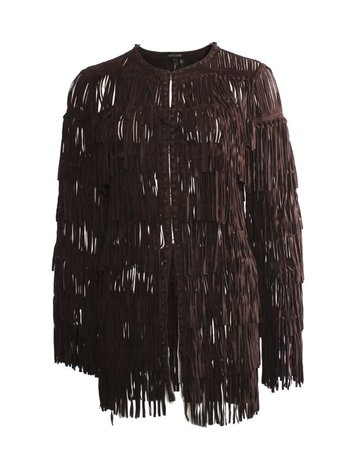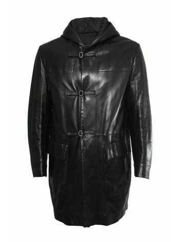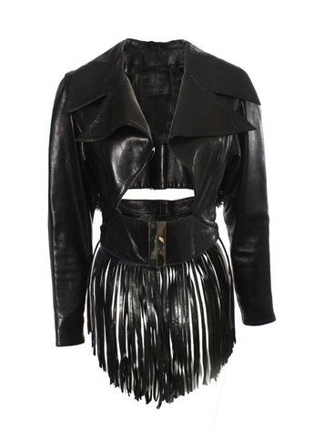 Claude Montana, Vintage zwart leren motorjas met bijzondere uitsnijdingen, uitgebreide decoratie en franjes op de rug. Het product is in goede staat, beperkt gebruikt en heeft zeer lichte gebruikerssporen over de gehele jas.
