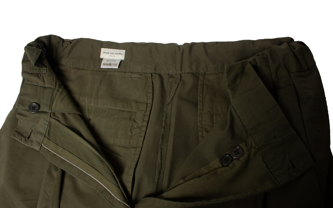 • Dries van noten, pantalon met wijde pijpen in legergroen. Het artikel is in goede staat. Een paar vlekken op de pijpen.