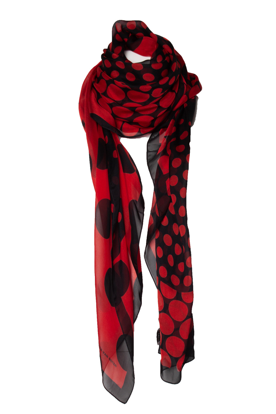 • Dries van Noten, zijden doorschijnende sjaal met stippen in zwart en rood. Het artikel verkeert in zeer goede staat.