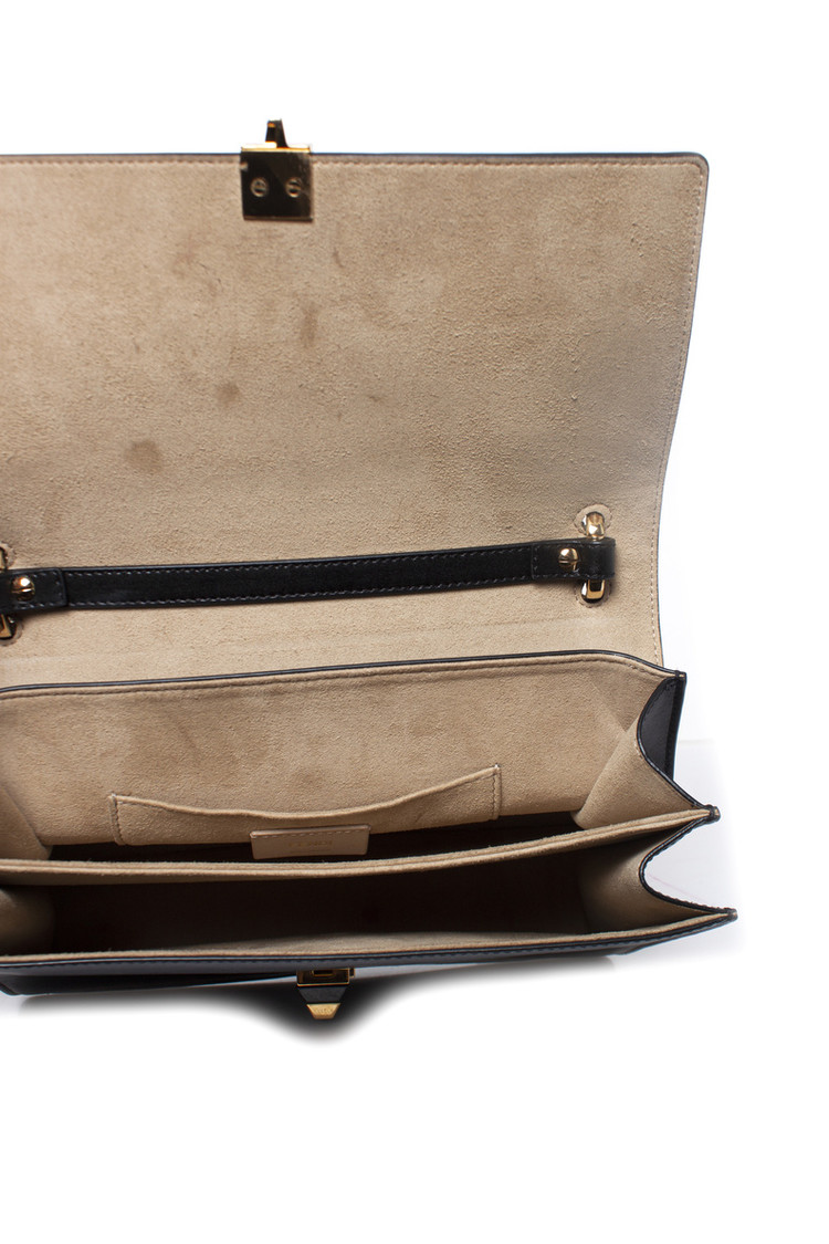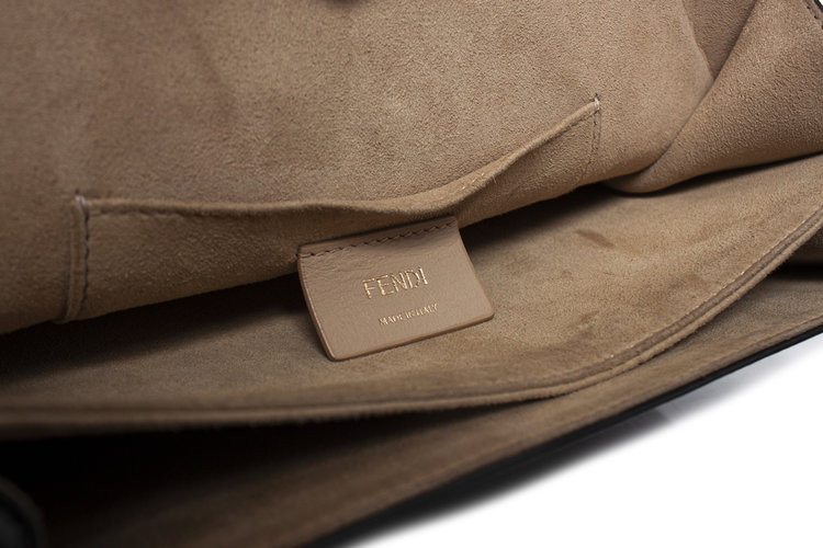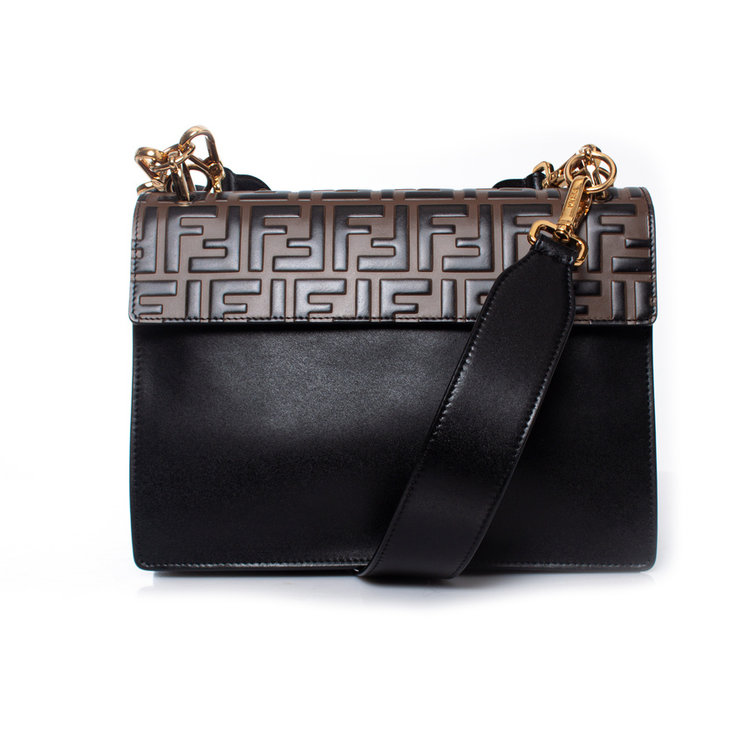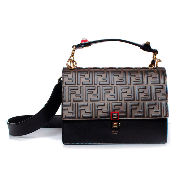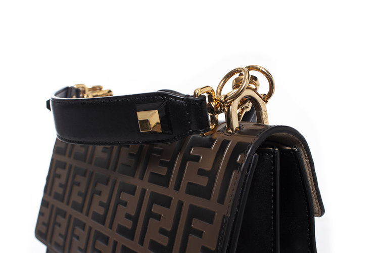 Dubbele F-logo's in reliëfstructuur de flap van een iconische tas, gemaakt in Italië van glad kalfsleer en afgezet met glanzende hardware. Een handvat aan de bovenkant, onderbroken door kenmerkende piramide-studs en schouderriem, beide verwisselbaar, laten je de look aanpassen.