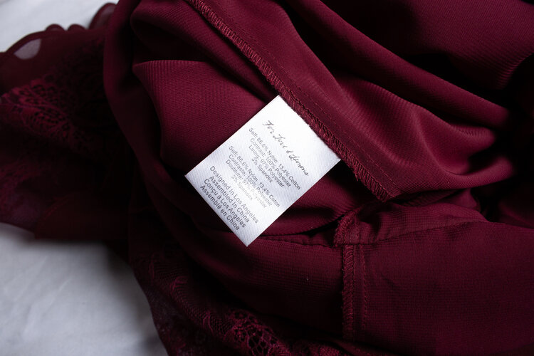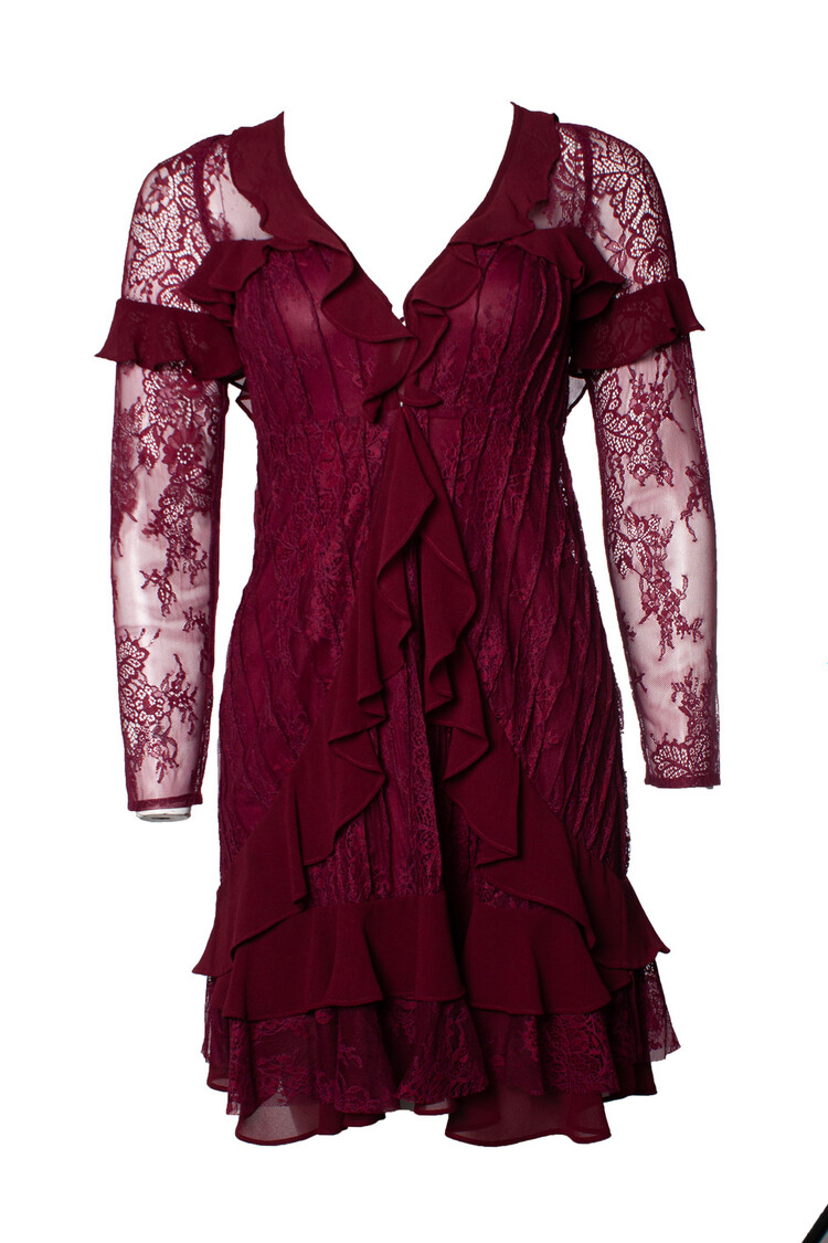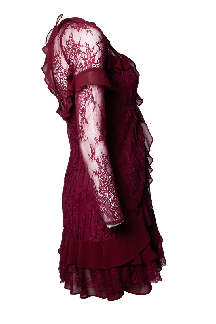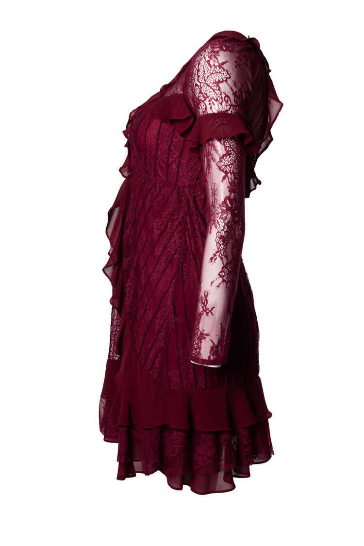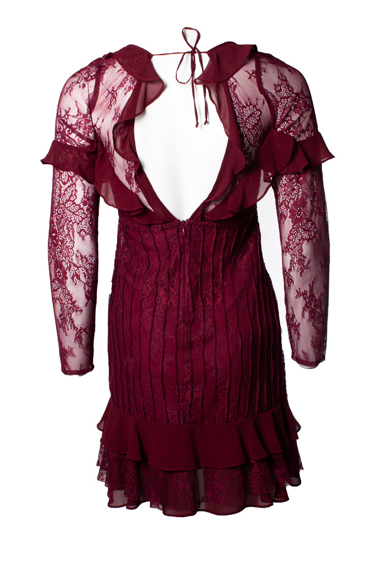 • For love & lemons, rode kanten jurk met ruches. Het artikel verkeert in zeer goede staat.