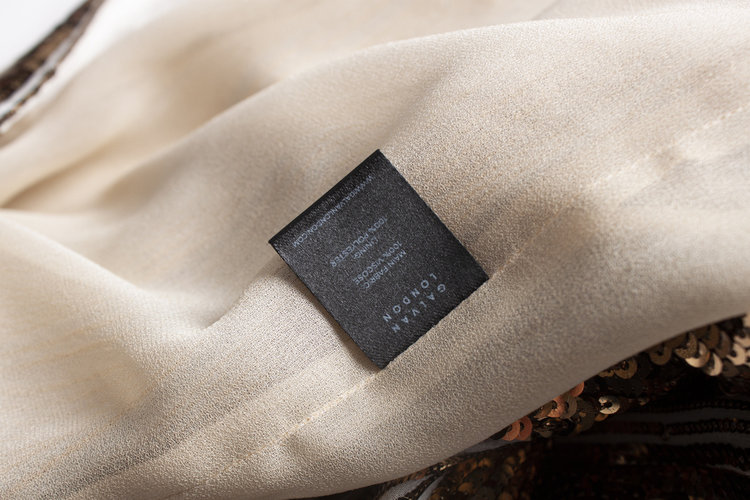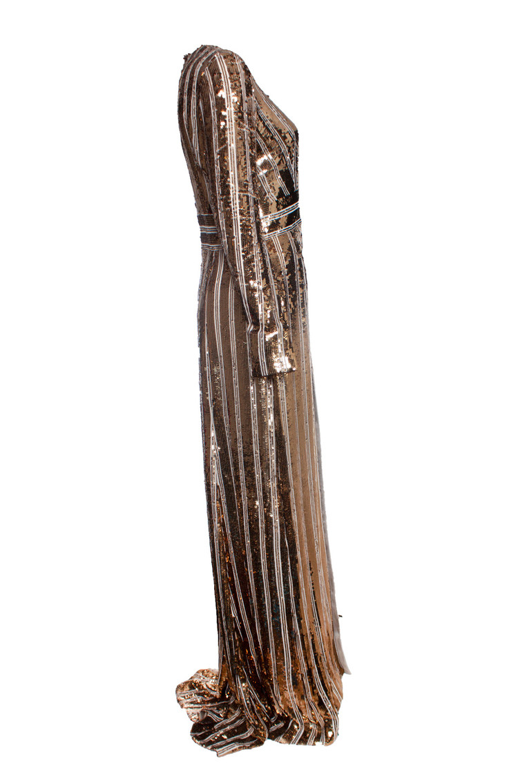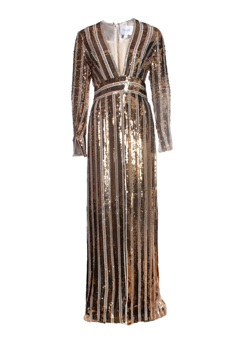 • Galvan, Stardust diepe hals jurk met lovertjes in goud. Dit item is een keer gedragen en verkeert in uitstekende staat.