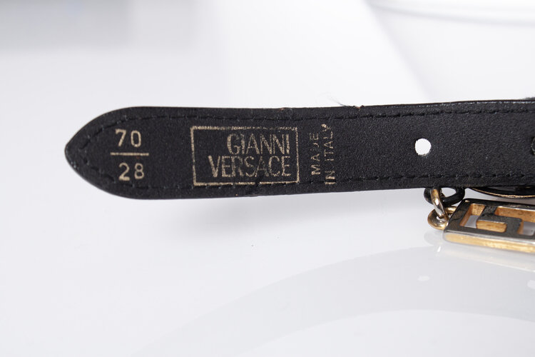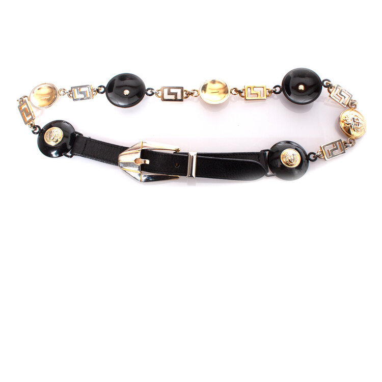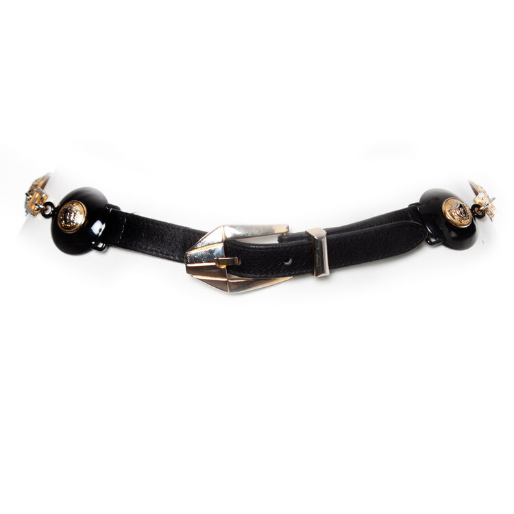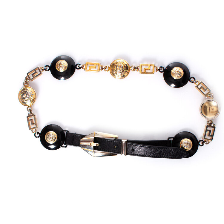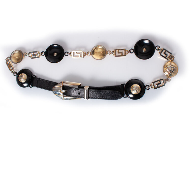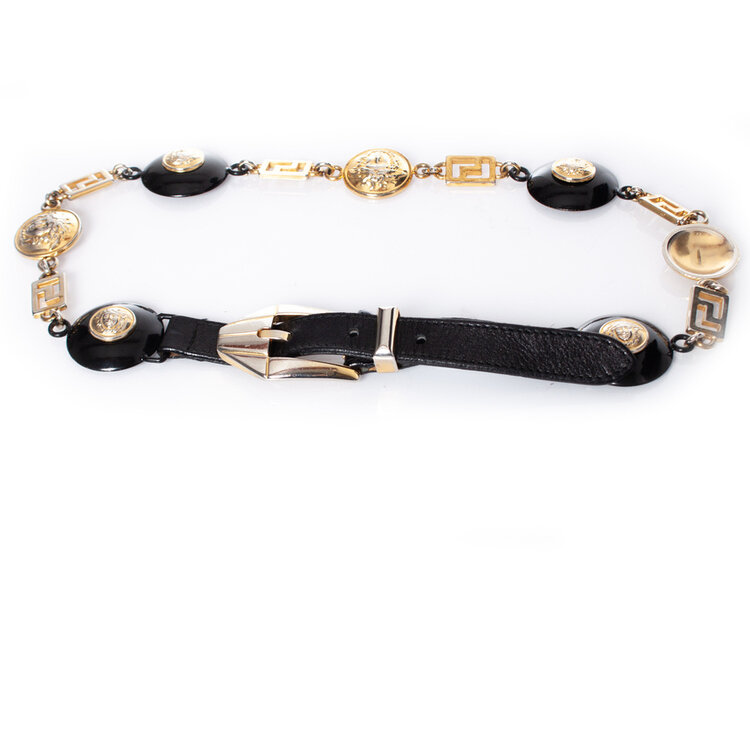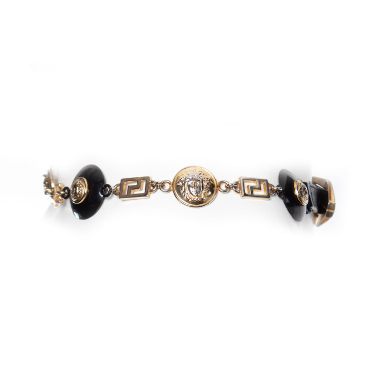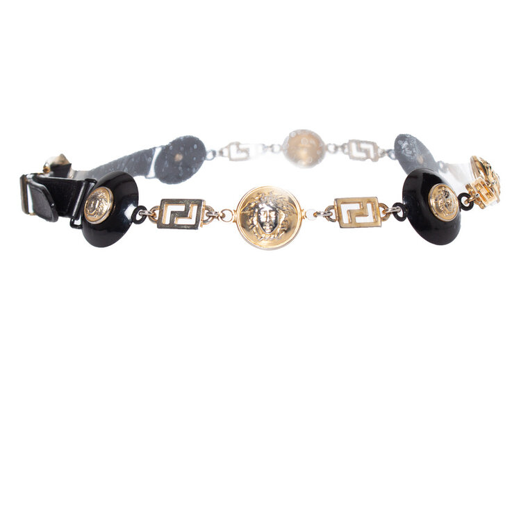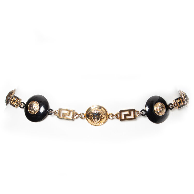 • Gianni Versace, Medusa kettingriem in zwart en goud. Het artikel is in goede staat. Lichte verkleuring op de hardware en lichte krasjes.