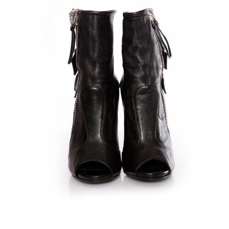 Giuseppe Zanotti, zwart leren peep-toe enkel laarsjes met zilveren ritsen in maat 38.5. Het item is verstevigd aan de zool en minimaal gedragen, en is in uitstekende conditie. het item komt met de originele dustbag.