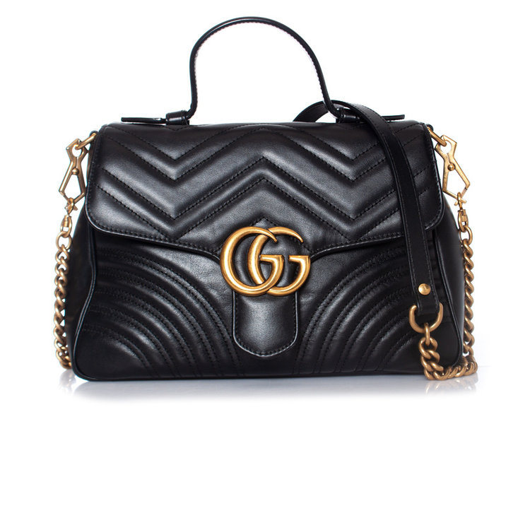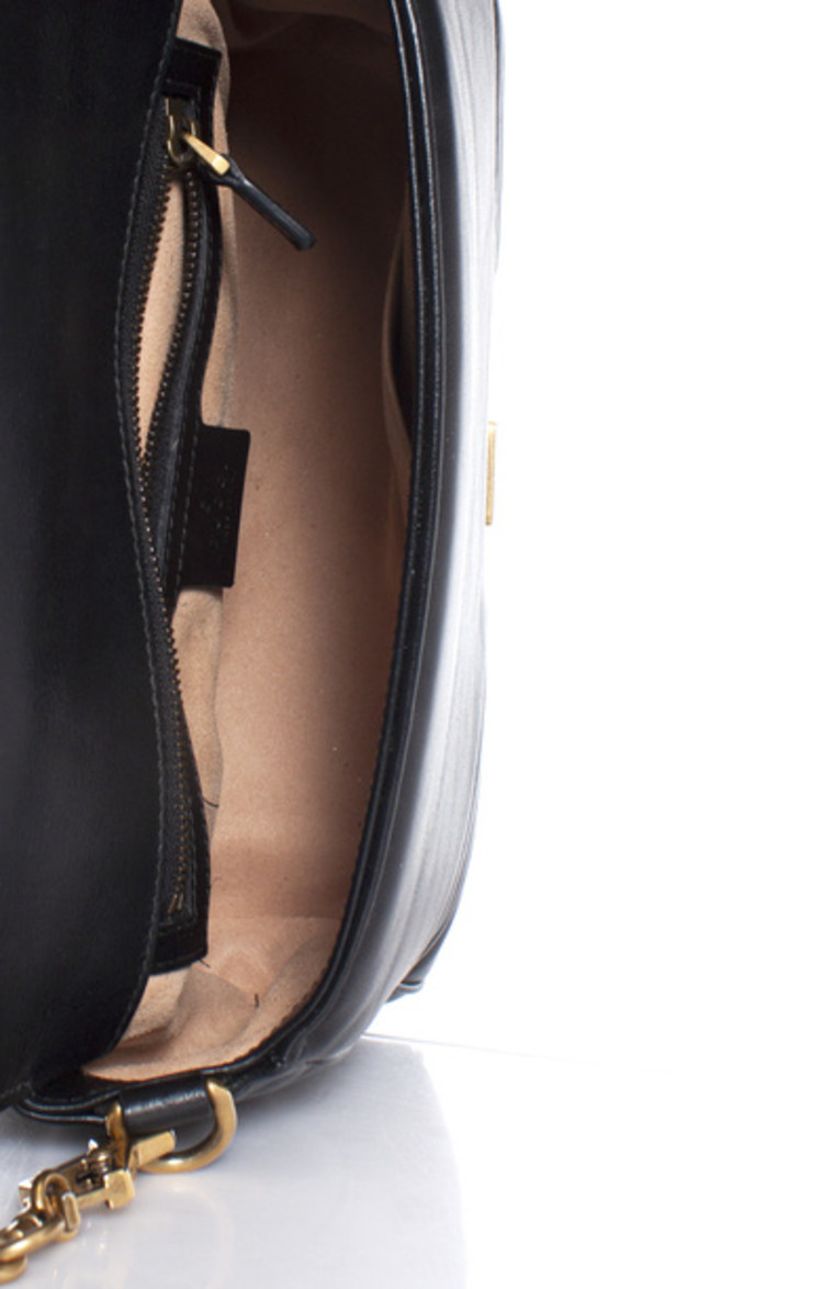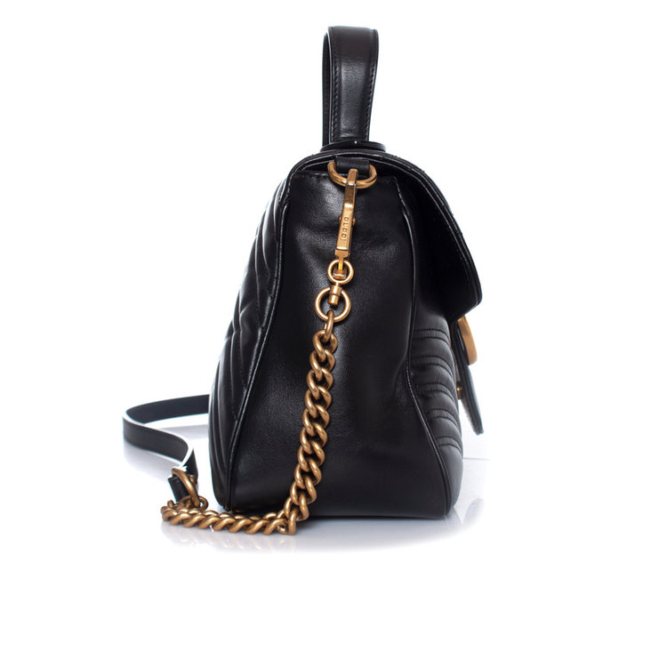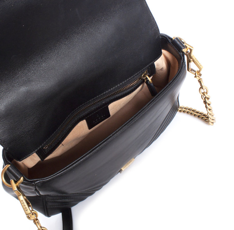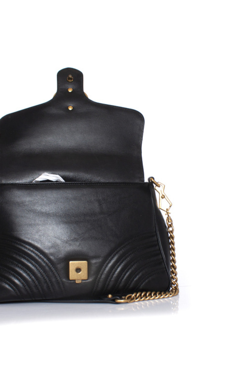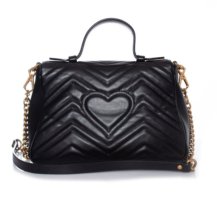 De kleine GG Marmont tas met handvat aan de bovenkant heeft een zacht gestructureerde vorm en een oversized klepsluiting met Double G hardware. Gemaakt van matelassé chevron leer met een hart op de achterkant.