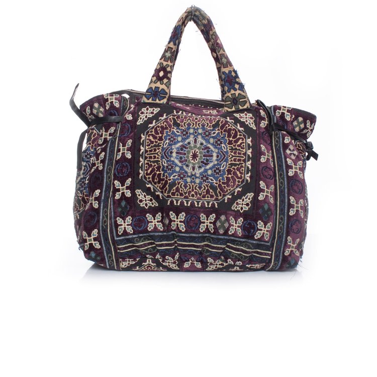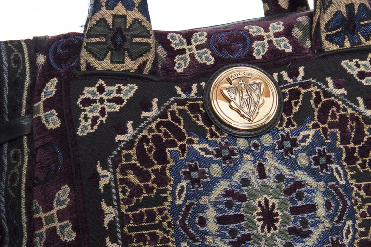 Gucci 'Tapestry Hysteria' shopper in donkerrood, groen en blauw geborduurd fluweel met details in zwart leer. Sluit met ritssluiting aan de bovenzijde. Gevoerd in zwart monogram nylon met twee open vakken aan de voorkant en een ritsvak aan de achterkant.