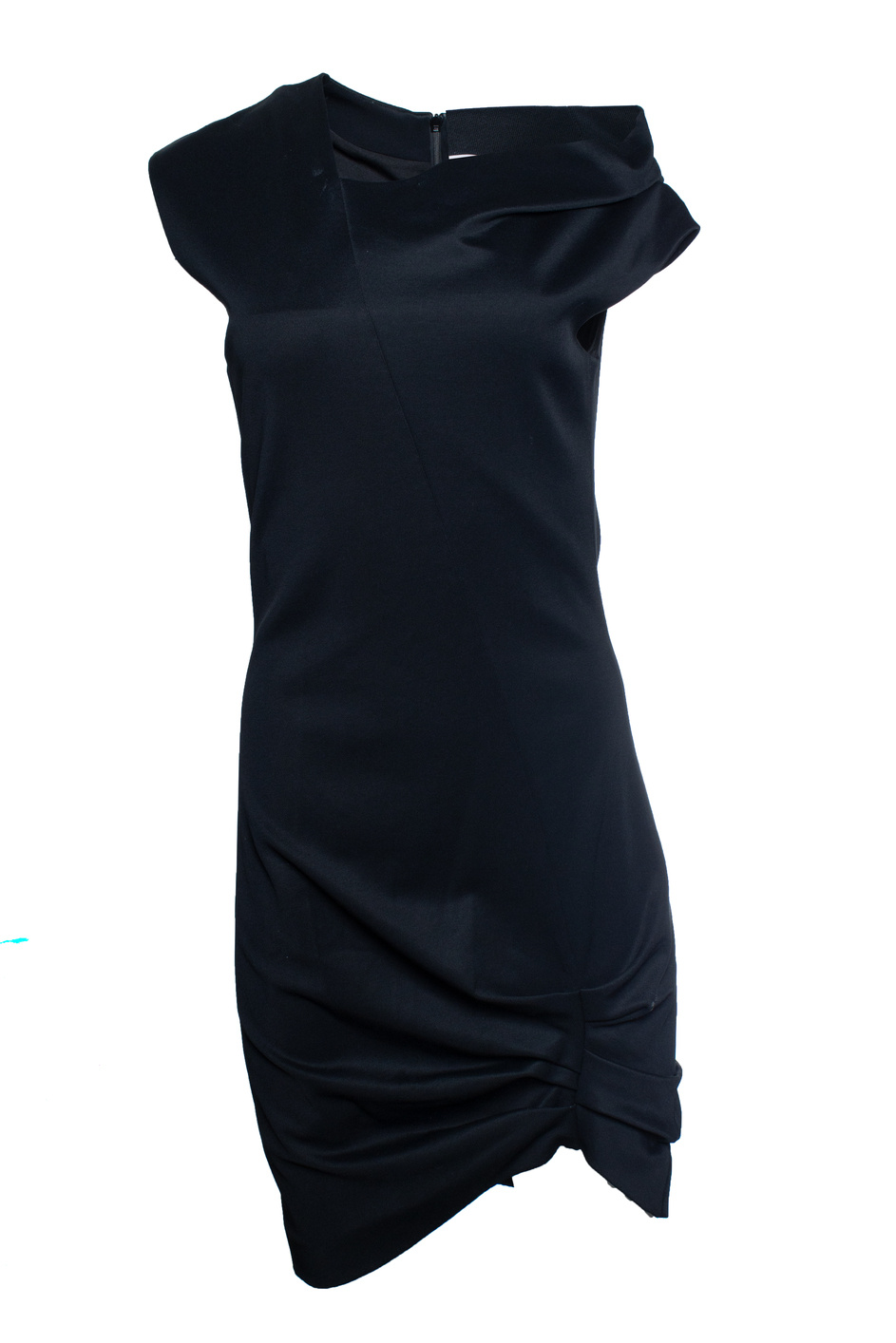 • Helmut Lang, zwarte asymmetrische off-shoulder jurk. Het artikel verkeert in zeer goede staat.
